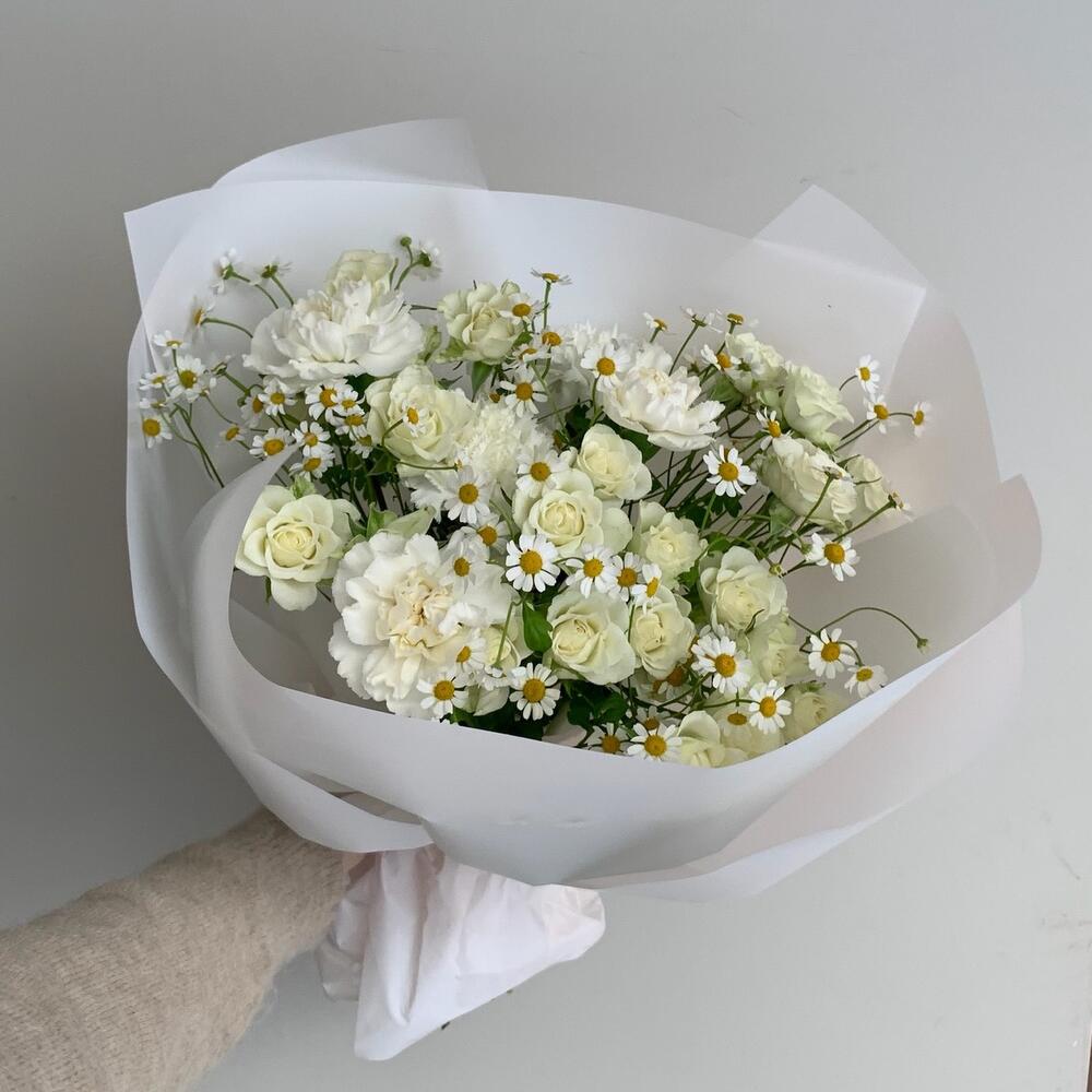 Delicate white bouquet with matricaria, dianthus and spray roses. The size is medium (M). The bouquet is wrapped in white paper with a satin ribbon. What you get: • A detailed care guide to help your flowers last longer • Flower food to preserve freshness up to 5-7 days • A gift bag for safe delivery Perfect for a romantic, sweet girl. She will be very happy to receive such a bouquet.