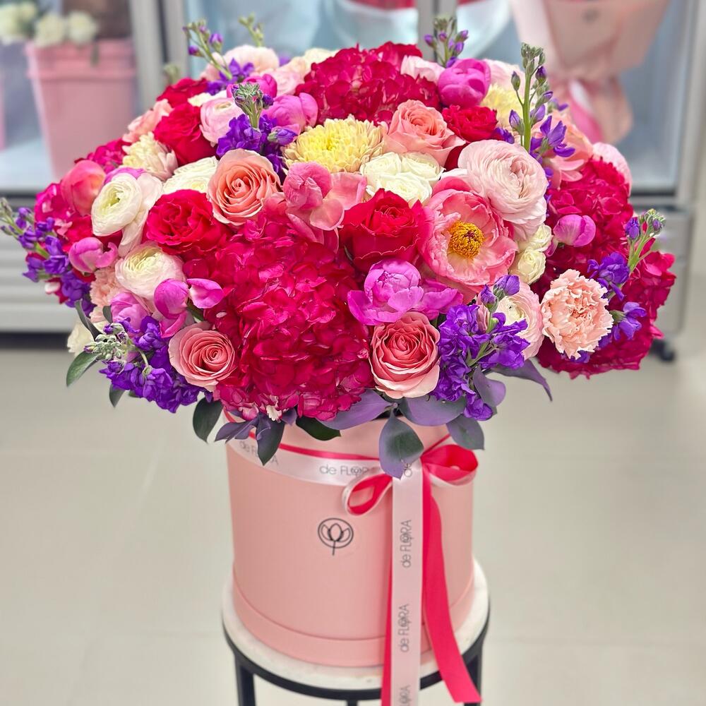 hydrangeas - 7 pcs dianthus - 15 pcs ranunculus - 10 pcs stock - 12 pcs peonies pink - 10 pcs roses pink - 15 pcs roses hot pink - 15 pcs