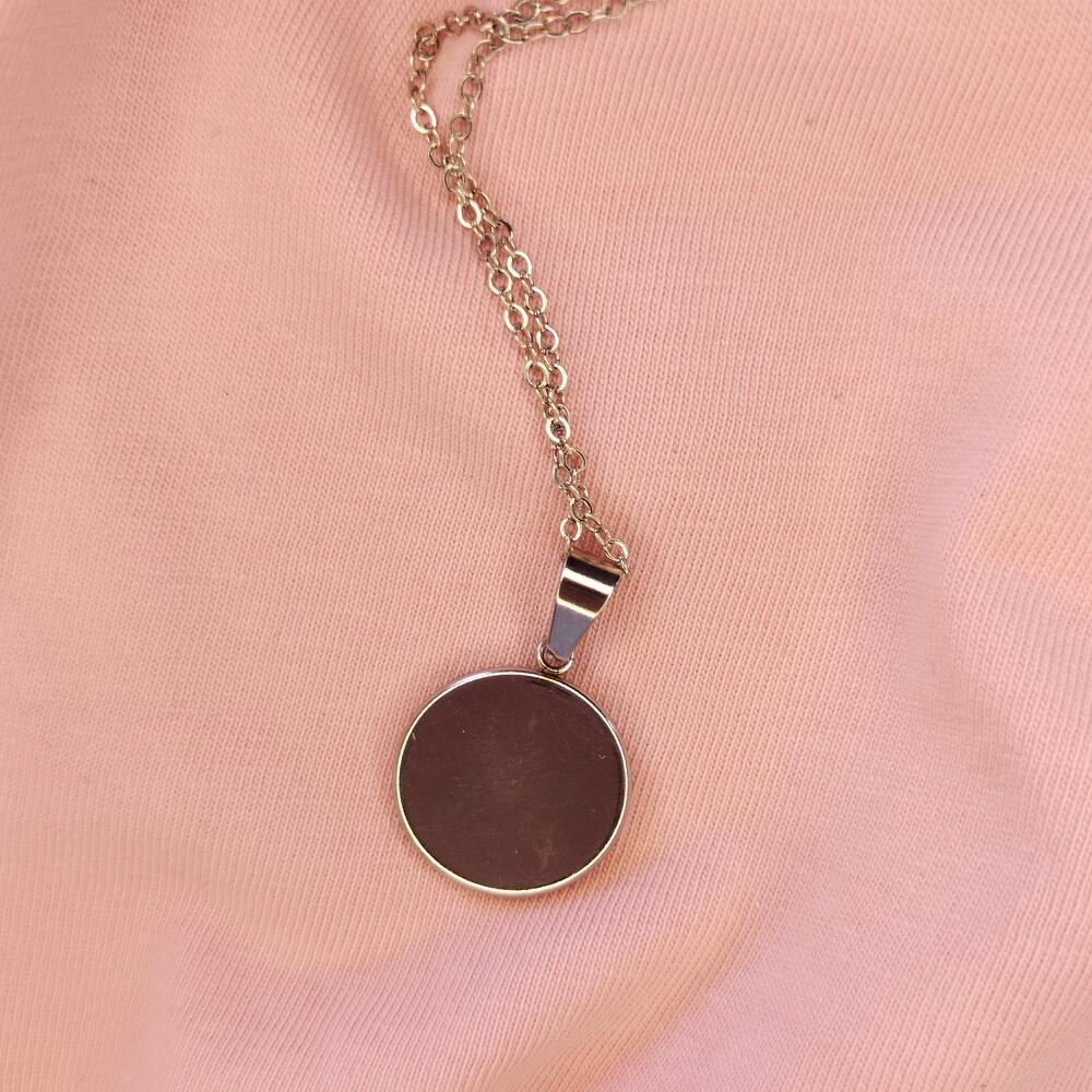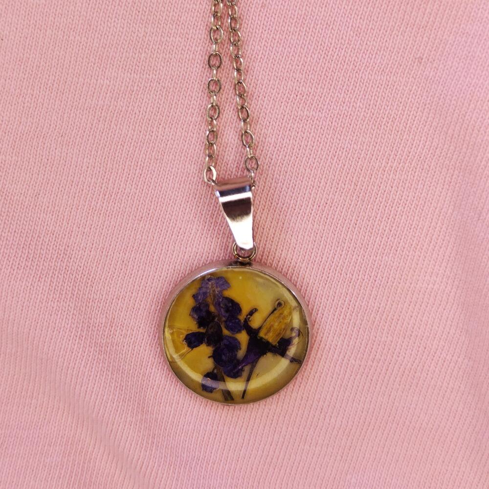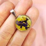 A pendant with real flowers in epoxy resin, made in a single copy. The metal material is stainless steel. Pendant diameter is 18 mm. The chain length is from 46 to 50 cm. You can choose the chain at your discretion