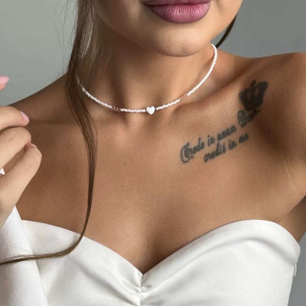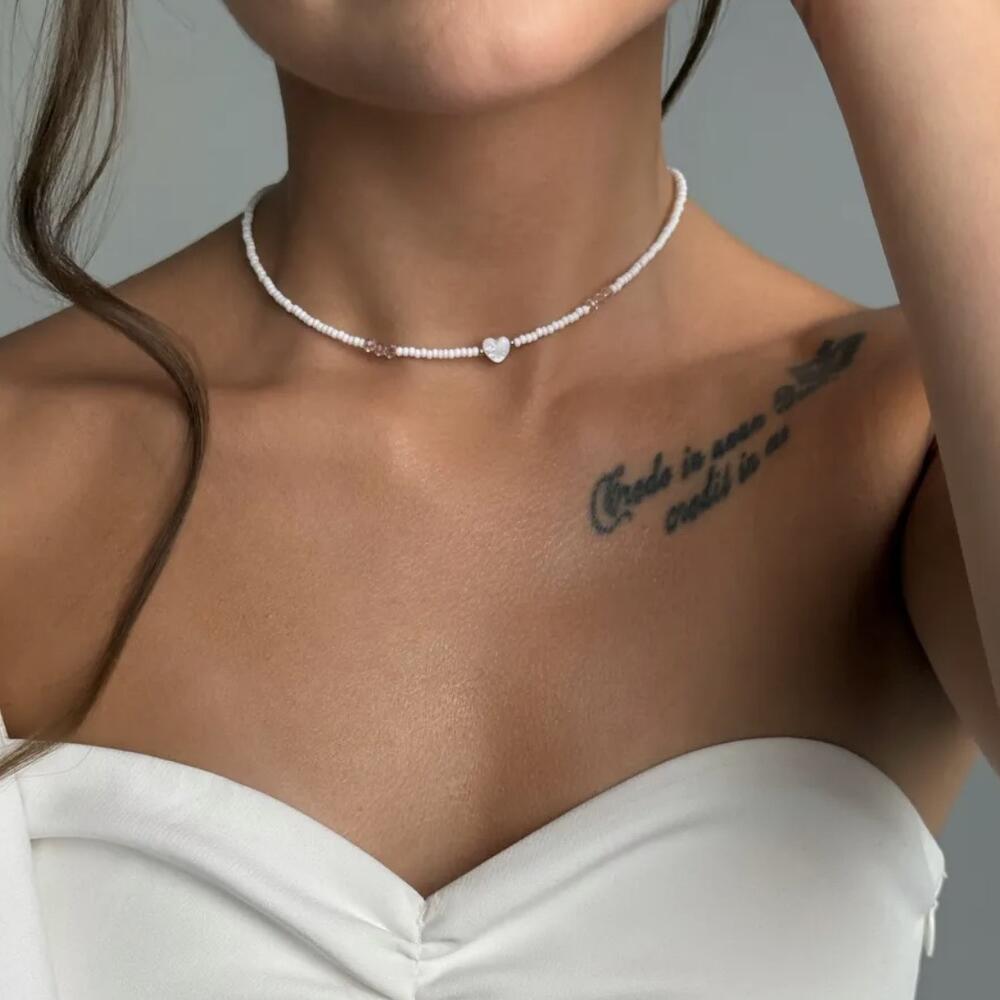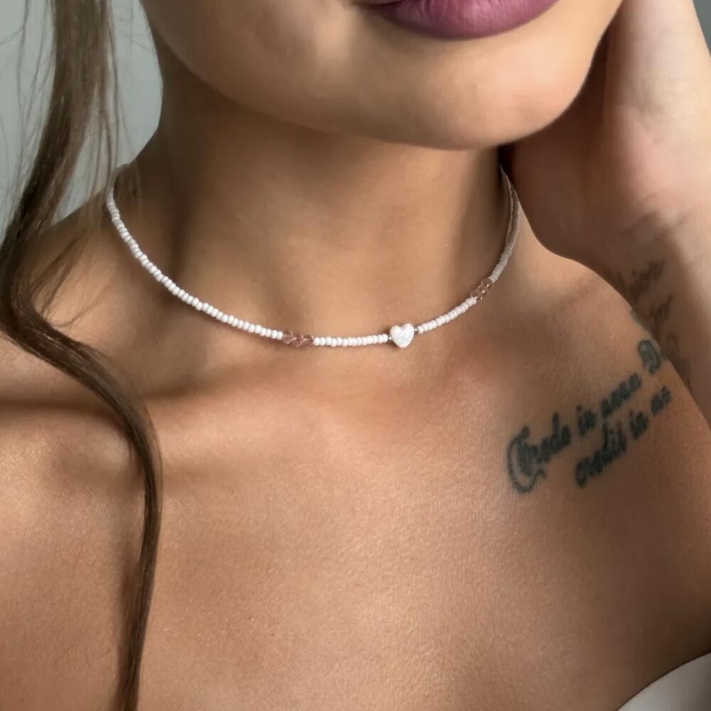 Handcrafted choker made of Czech beads, diamond glass and mother-of-pearl heart with a high-quality stainless steel clasp.