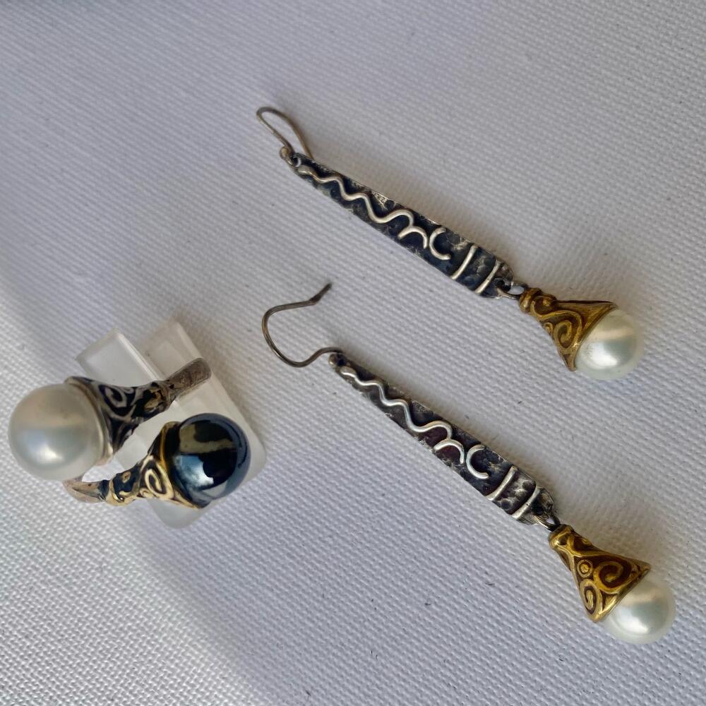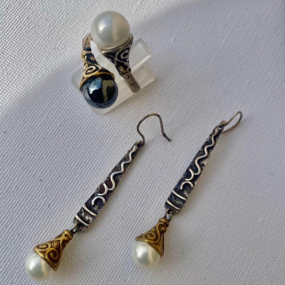 Серебряный комплект в этническом стиле ручной работы.Покрытие чернь и позолота 999пробы.Вставка Майорка и гематит.Вес изделия 16.7гр