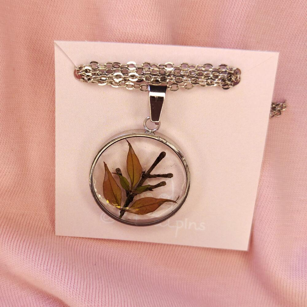 Transparent pendant with real flowers in epoxy resin, diameter 22 mm. Made in a single copy. Material is stainless steel. The chain length is from 46 to 50 cm. You can choose the chain at your discretion