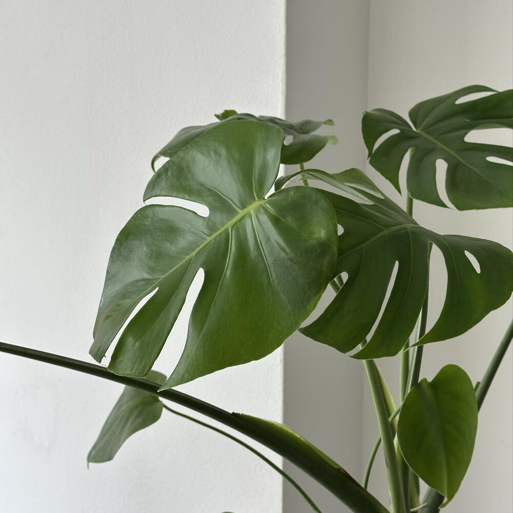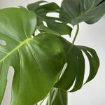 Monstera thrives in bright, indirect light but can tolerate partial shade. Water when the top layer of soil is dry — about once a week. Keep humidity moderate to high, especially in winter — misting or a humidifier will help. Wipe the leaves to keep them clean and support the plant as it grows. From spring to fall, feed every 2–3 weeks with a foliage plant fertilizer. In winter, reduce watering and stop feeding.