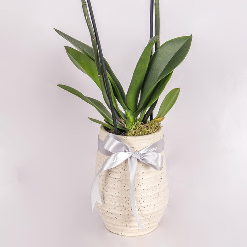 Adorn your space with the graceful beauty of this pink orchid. With its delicate blooms and lush green leaves, this potted orchid adds a touch of natural elegance to any room. It comes nestled in a charming pot, ready to brighten your home or make a thoughtful gift.