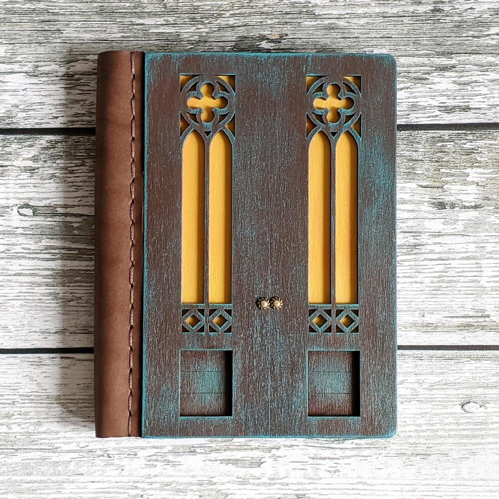A unique handmade notebook with a door-shaped cover is a great gift for an artist, someone who sketches, takes notes, keeps a diary or day planner, or any lover of unusual gifts. THE COVER OF THE JOURNAL We make covers from high-quality plywood, paint them by hand with acryl paints and then cover them with water-base varnish. That is why the texture of every journal cover is unique. The hardcover works as a hard surface to let you draw or make notes anywhere you get inspired. The plywood cover protects paper as well. ECO-LEATHER BINDING For binding we use high-quality eco-leather. It is wear proof and pleasant to touch. PAPER We use fine designer eco paper Flora Anice that is 30% recycled and contains plant inclusions, so each page looks unique and textured. Еhe color of the paper is soft cream. It is suitable for pencils, pens and liner. The pages are padded, so it is easy to unfold the journal flat and write and draw in it. The journal has 64 sheets (128 pages). HARDWARE We use metal hardware to make our journals look prettier and smarter. If you have questions left or you want to customize your purchase, feel free to contact me and I will try to make your dream journal :)