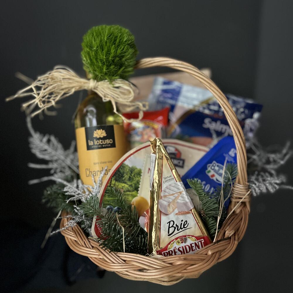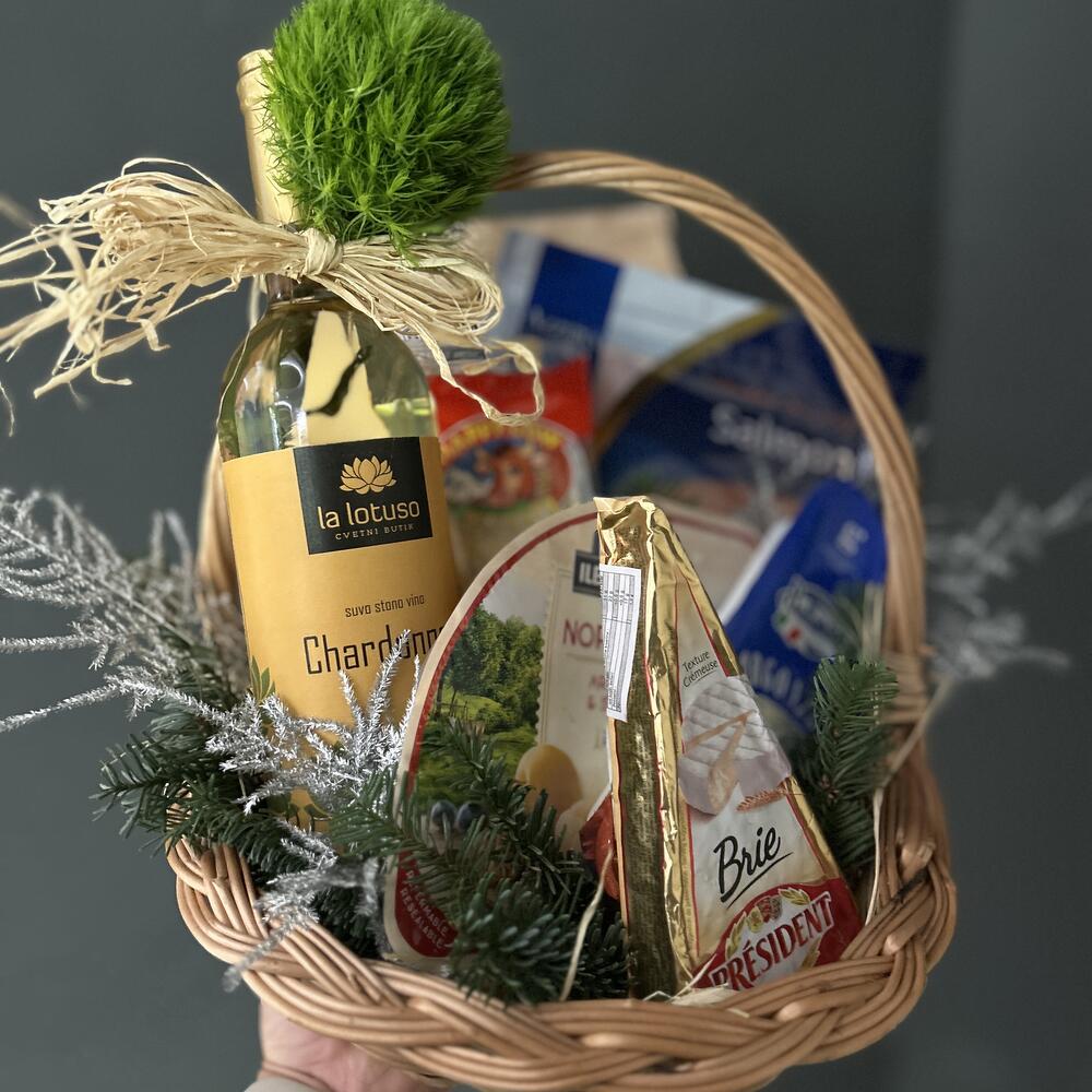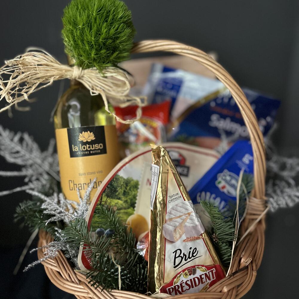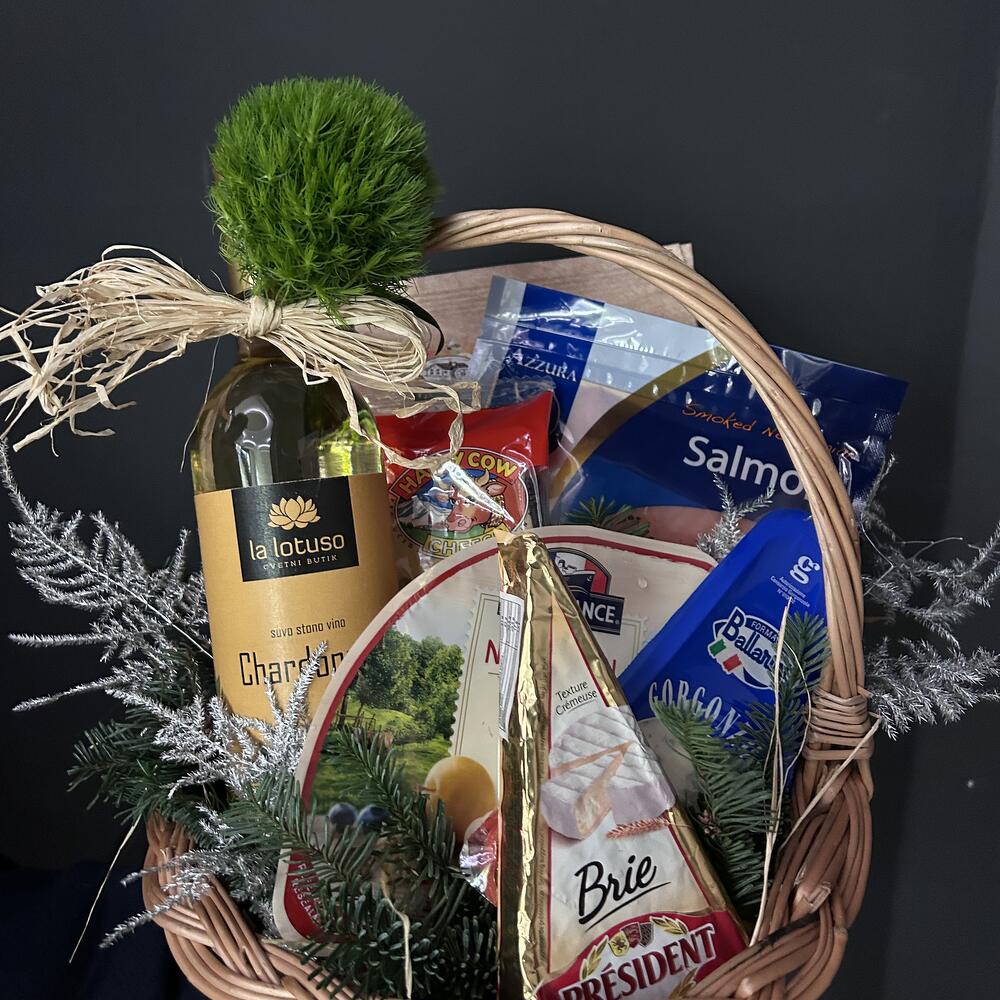 - Florist wine of choice: Chardonnay, Merlot or Merlot Rose 750ml - four different tips of cheese 100g - Salmon slices 100gr - Integral oven 1 pc 280g - Decorative wicker basket - Greenery - Raffia or decorative bow at the customers request Note: The arrangement is subject to change by the manufacturer depending on the current availability of the item. - At the customers request, fresh or potted flowers can be added, and the price is subject to change