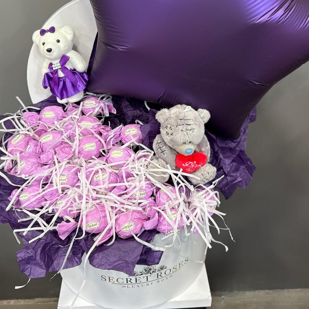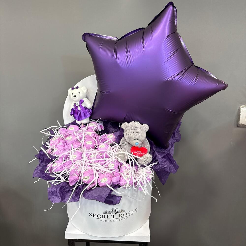 Silence - 2 pcs Hat box - 1 pcs The bear is soft - 2 pcs Balloons foil star - 1 pcs шоколад соринни - 19 pcs
