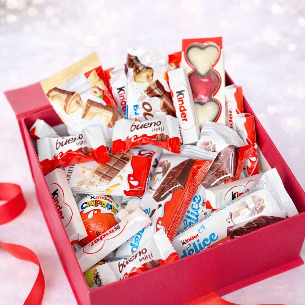 Стильная розовая коробка с красной лентой, наполненная вкусными шоколадками Kinder. Идеально подойдёт для дня рождения, романтического сюрприза или приятного знака внимания. Готовый и красиво оформленный подарок. Elegant Gift Box with Sweets A stylish pink gift box tied with a red ribbon and filled with delicious Kinder chocolates. A perfect choice for birthdays, romantic surprises, or simply to make someone smile. Ready-to-gift and beautifully presented.