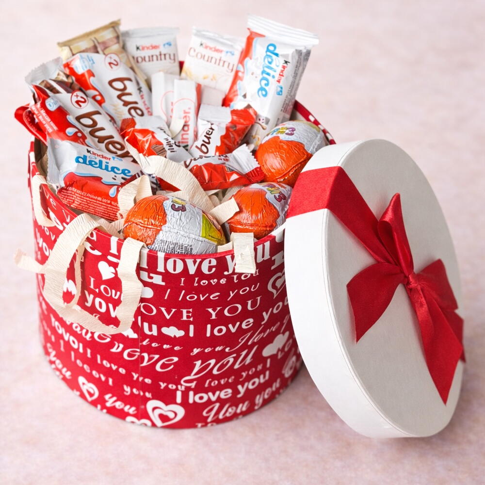 Романтичная подарочная коробка с любимыми сладостями Kinder. Стильная круглая коробка с красной лентой — идеальный способ выразить любовь и заботу. Отличный подарок на День святого Валентина, годовщину, день рождения или просто без повода. Красиво оформлена и полностью готова к подарку.🎁 A romantic confectionery gift box filled with everyone’s favorite Kinder treats. This stylish round box with a red ribbon is perfect for expressing love and warm feelings. A wonderful gift for Valentine’s Day, anniversaries, birthdays, or just to make someone smile. Beautifully arranged and ready to gift.🎁