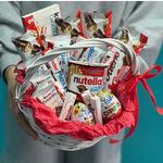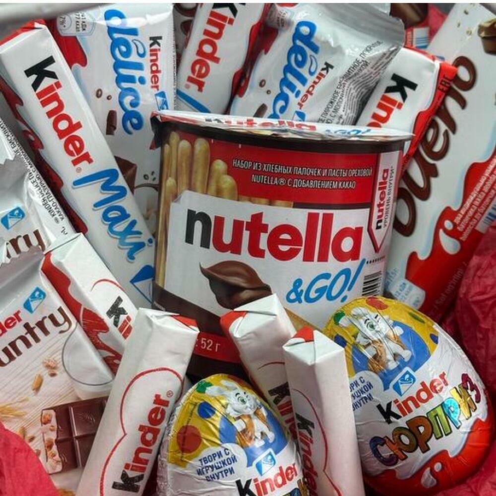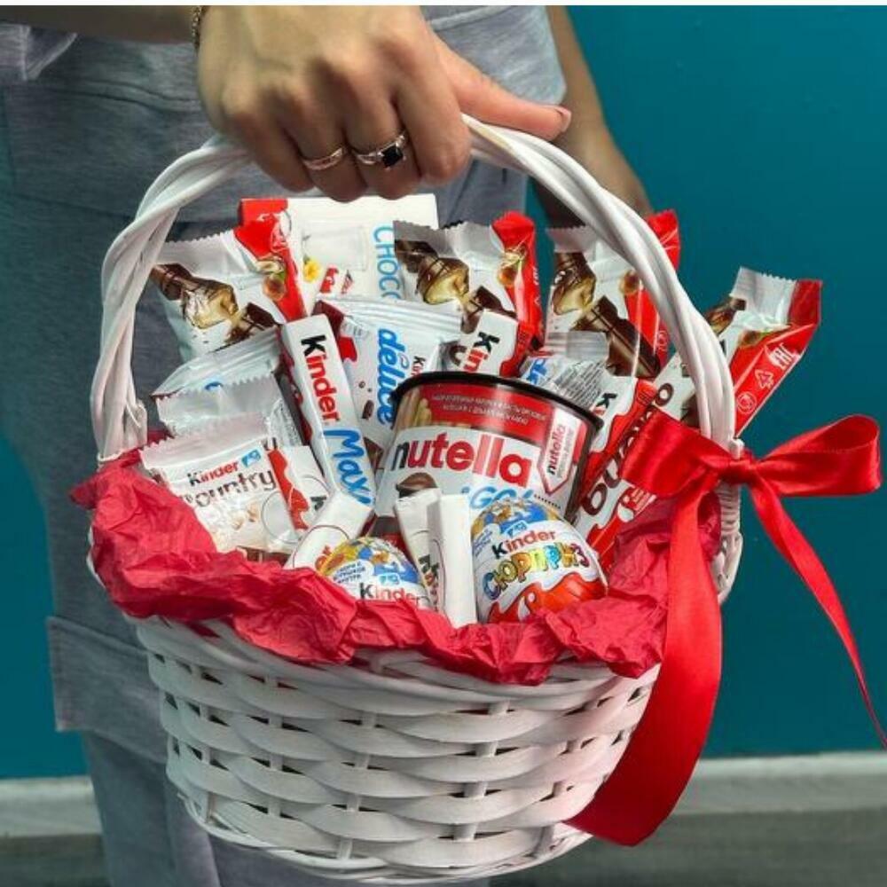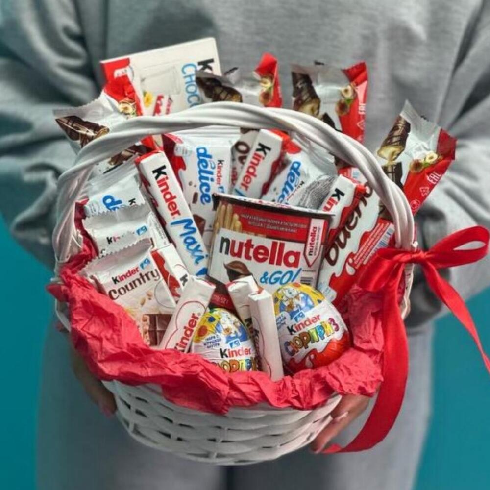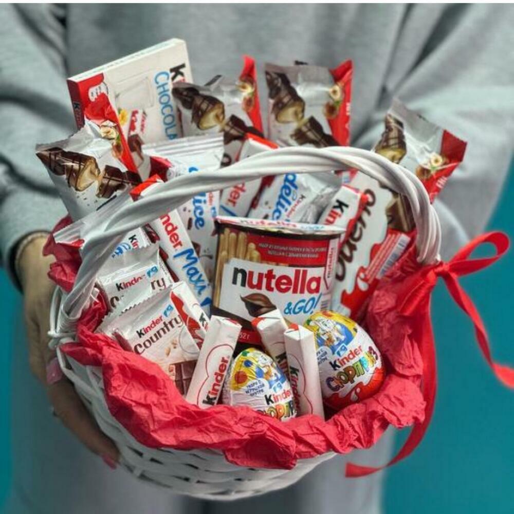 Silence - 2 pcs Satin Ribbon - 2 pcs Kinder surprise - 2 pcs Basket wicker - 1 pcs Kinder chocolate - 2 pcs Kinder Delis - 3 pcs Kinder maxi - 3 pcs Kinder Country - 3 pcs kinder bueno - 4 pcs kinder nutela - 1 pcs