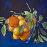 Ova realistična mrtva priroda prikazuje mandarine sa grančicama i lišćem u staklenoj činiji, na bogatoj plavoj pozadini. Slika istražuje sklad boje, svetla i forme, stvarajući mirnu, ali izražajnu atmosferu. Rad se oslanja na klasičnu tradiciju mrtve prirode uz lični slikarski izraz. Slika nije uramljena!
