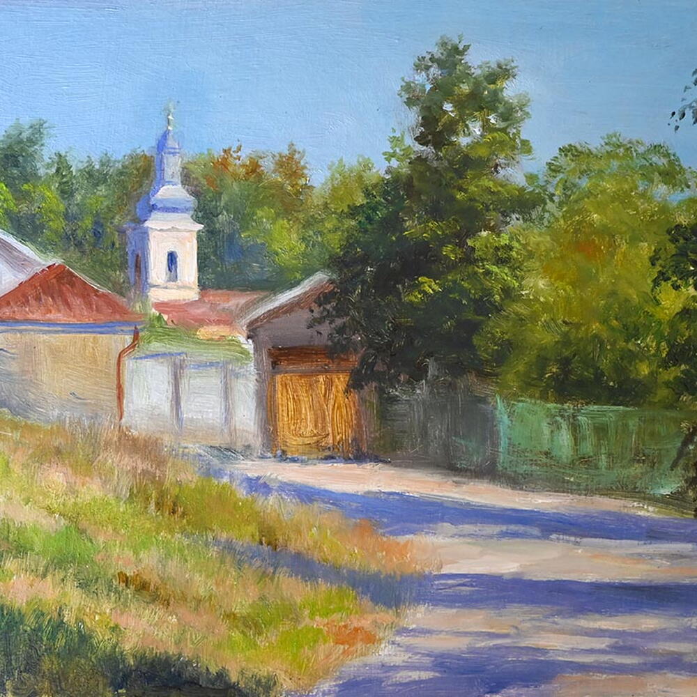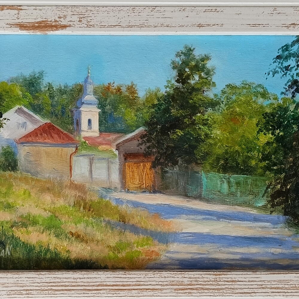 Ova slika prikazuje deo naselja Sveta Petka u Šidu — miran seoski pejzaž sa crkvom, kućama sa crvenim krovovima i putem koji prolazi kroz zelenilo. Kompozicija je zasnovana na prirodnom svetlu i suptilnim prelazima boja. Rad je izveden u realističnom maniru, sa pažnjom usmerenom na odnos arhitekture i pejzaža, kao i na atmosferu tišine i svakodnevnog života u vojvođanskom selu. Slika nosi karakter plenera i neposrednog posmatranja prirode.