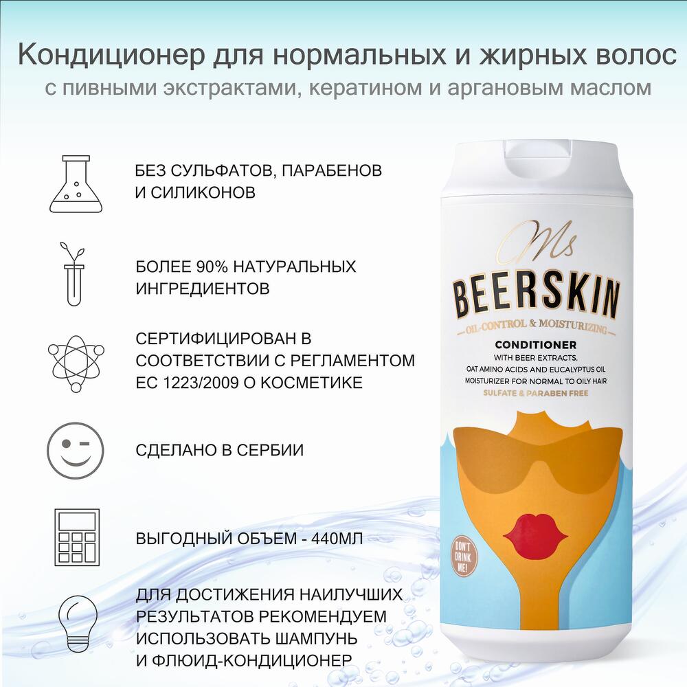 Step 2: Oil Control & Moisturizing Conditioner with Beer Extracts, Oat Amino Acids & Eucalyptus Oil Moisturizer for normal to oily hair Ms Beerskin Oil Control & Moisturizing Conditioner lightweight formula offers superior conditioning and protection to hair without weighting it down. Its rich formula makes hair soft and silky, improves wet and dry combability and provides good antistatic properties. It contains 4 main Beer Extracts (hydrolyzed yeast extract, barley seed extract, hop extract and oat extract) with high proportion of biologically relevant proteins, vitamins and minerals. The action of Raphanus Sativus Seed Extract and Magnolia Officinalis Bark Extract are synergized to protect hair against heat damage, prevent UV-induced color fading, increase hair antioxidant potential and protects it from UV-induced degradation. Argan Oil and Keratin help fortify hair shaft, replenishing hair's natural protein to enhance strength and elasticity. Eucalyptus Globulus Leaf Oil and Panthenol work in synergy with aromatic mix of 15 Herbal Extracts to re-energize scalp, prevent hair damage, thicken hair, improve luster and sheen, and moisturize hair. Formula is free of sulfates, parabens and silicones.