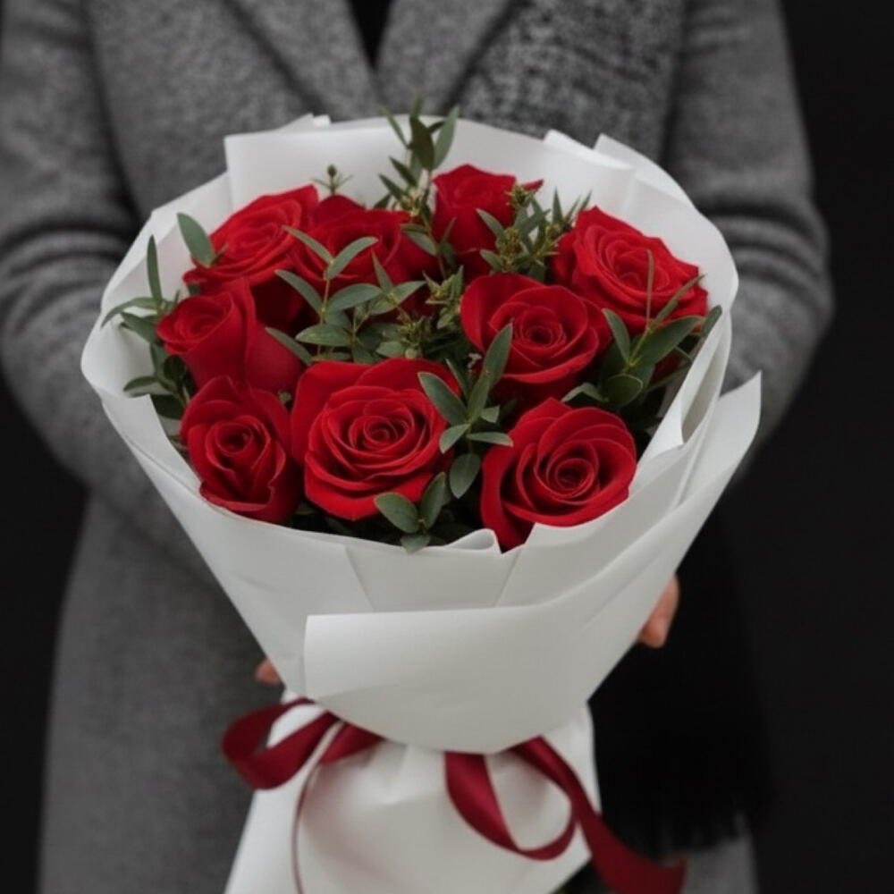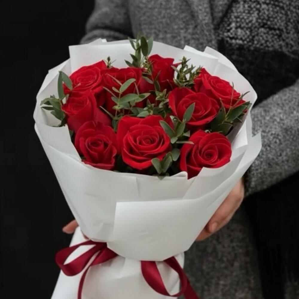 9 Rosas Rojas Explorer Ramo de follaje de Pistacia / Ramo de 9 rosas rojas Explorer