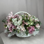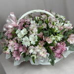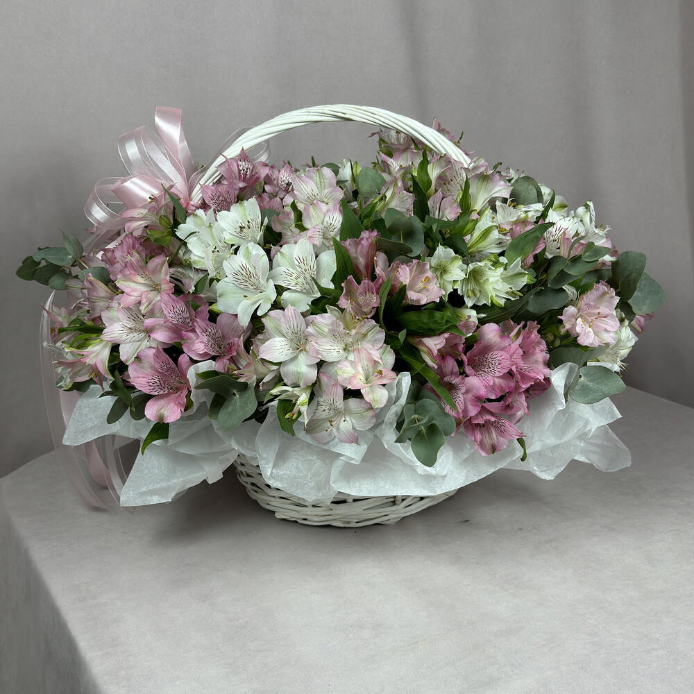 Альстромерия - 33 ud. Тишью - 2 ud. Cesta de mimbre - 1 ud. биолор - 2 ud.