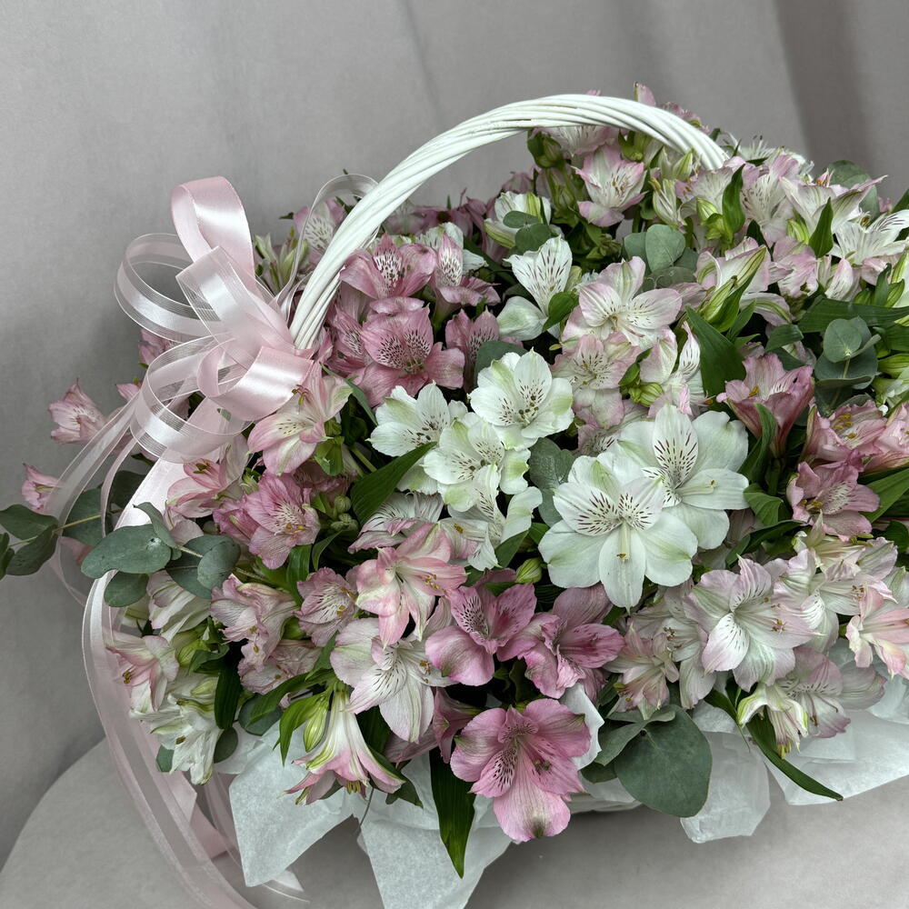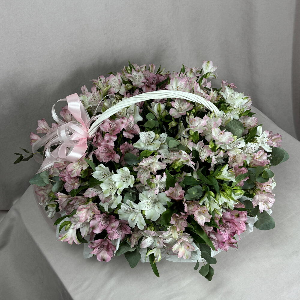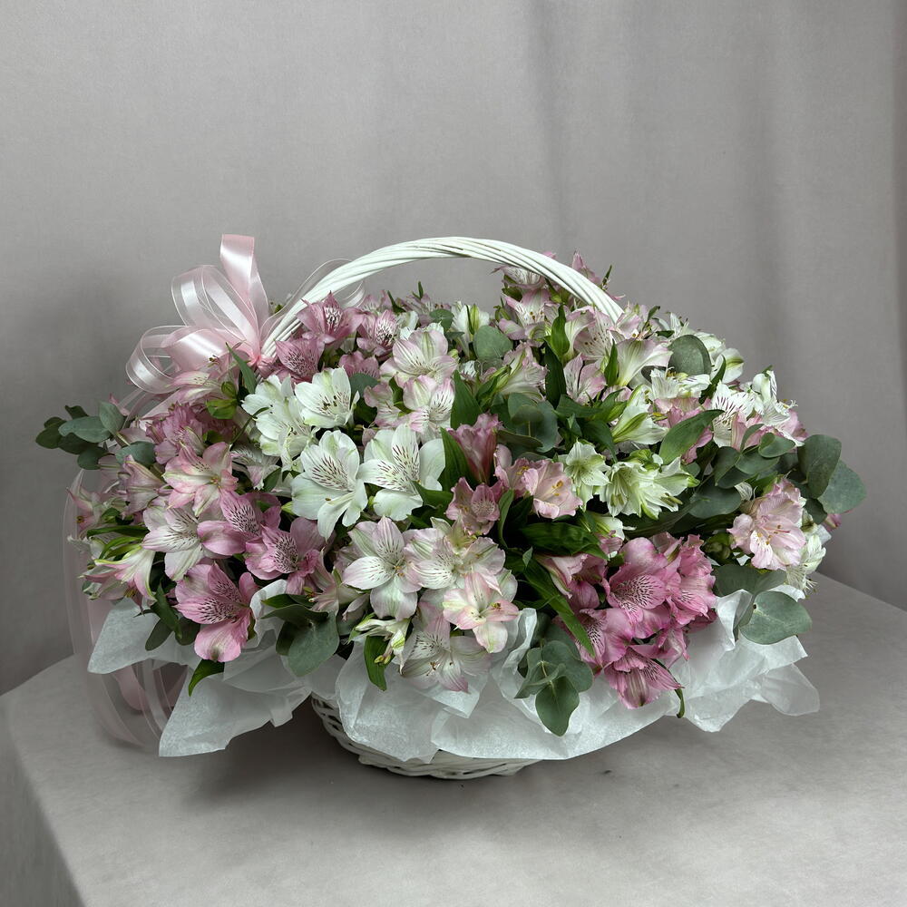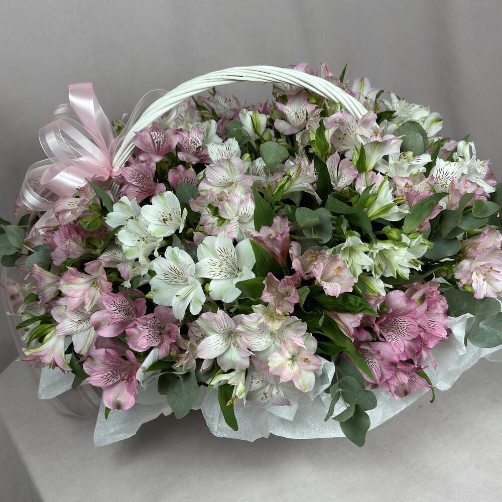 Великолепная композиция из 33 бело-розовых альстромерий, украшенная свежим эвкалиптом, создаёт нежный и изысканный образ. 🥰 Большой и шикарный букет станет прекрасным подарком для мамы на юбилей, жены или коллеги, а также стильным украшением интерьера. 🌸 В оформлении использованы элегантные атласные ленты и тишью, которые придают композиции дополнительную воздушность и утончённость. Эта цветочная корзина — идеальный выбор для особого случая и выражения самых тёплых чувств.