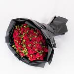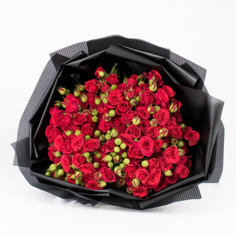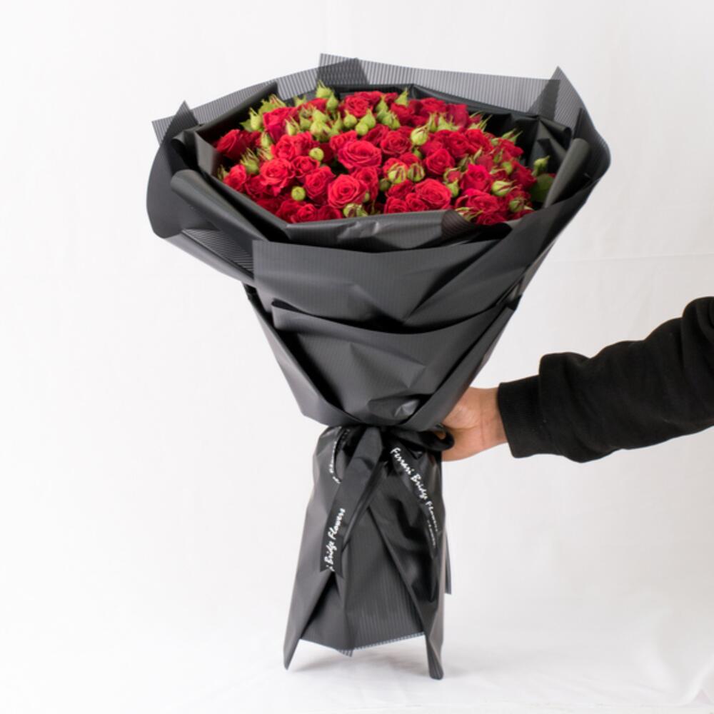 Hand bouquet of red spray roses nicely wrapped with black wrapping