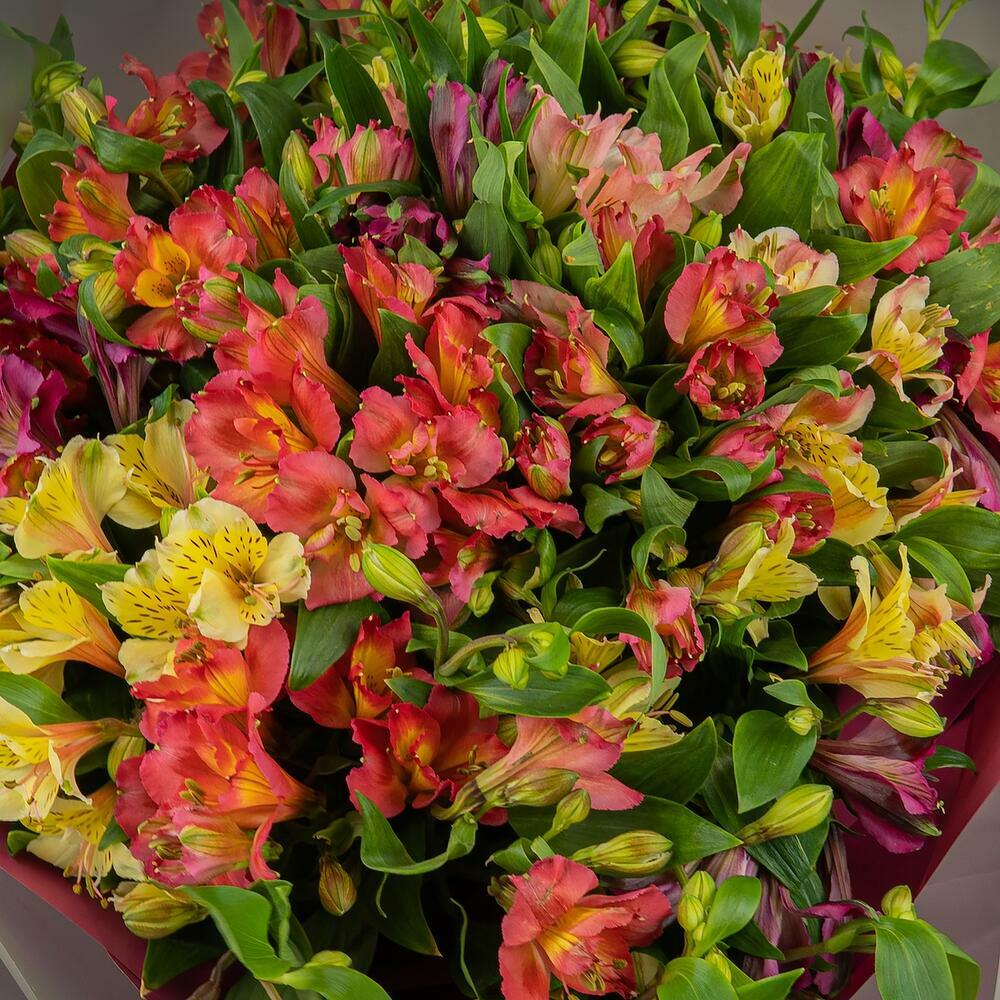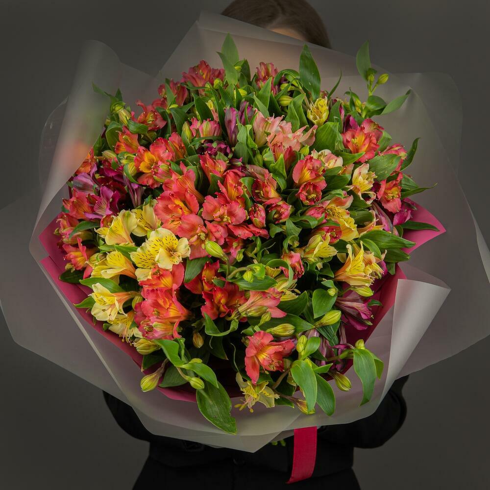 Большой и объемный букет из микса альстромерий в разной цветовой гамме. Букет оформлен в стильной и трендовой упаковке из матовой корейской пленки.