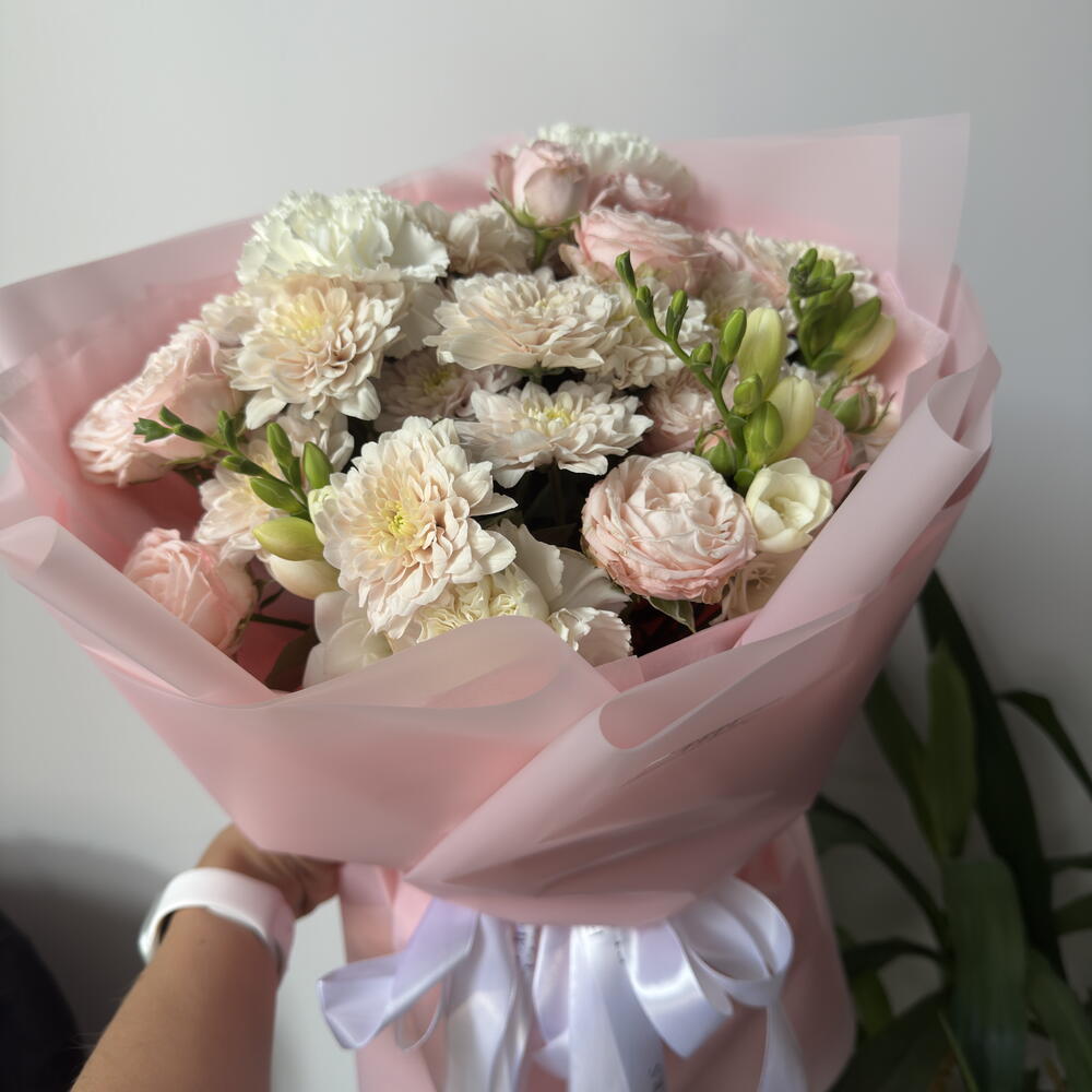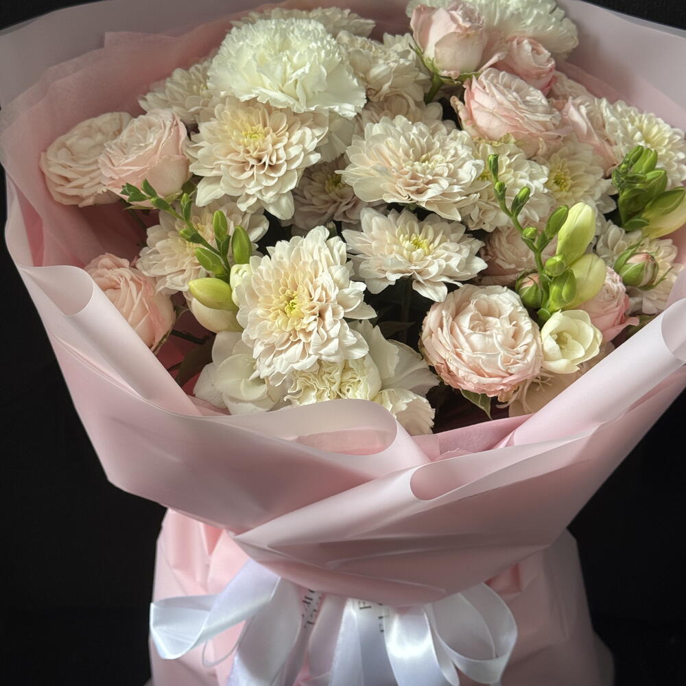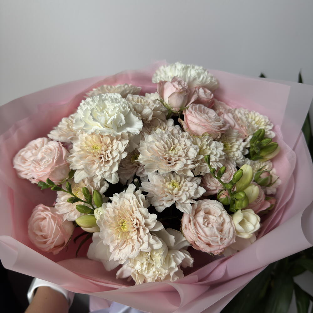 El crisantemo - 3 ud. dianthus - 3 ud. bombastic spray rose - 3 ud. freesia - 3 ud.