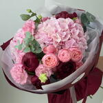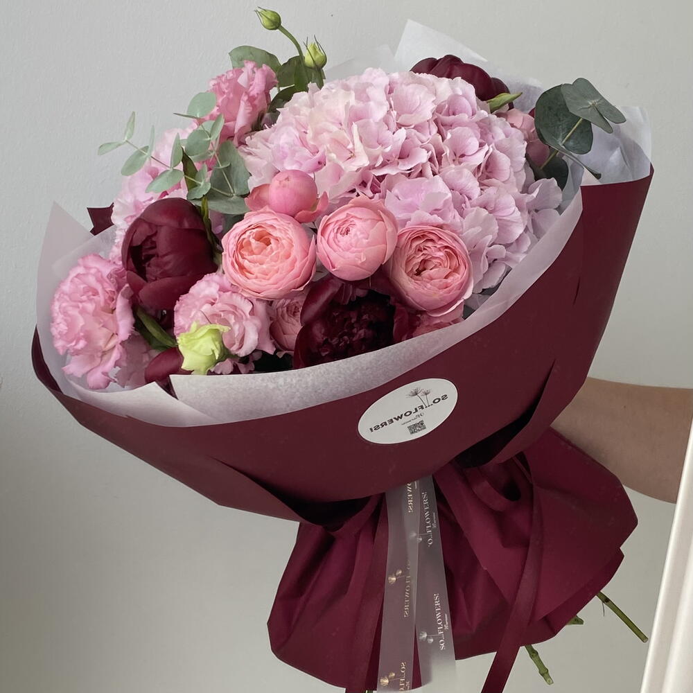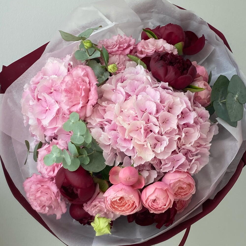 Eustoma - 3 ud. Eucalyptus - 5 ud. Hydrangea - 2 ud. Peonies - 5 ud. ramillete de rosas - 2 ud.