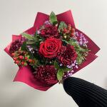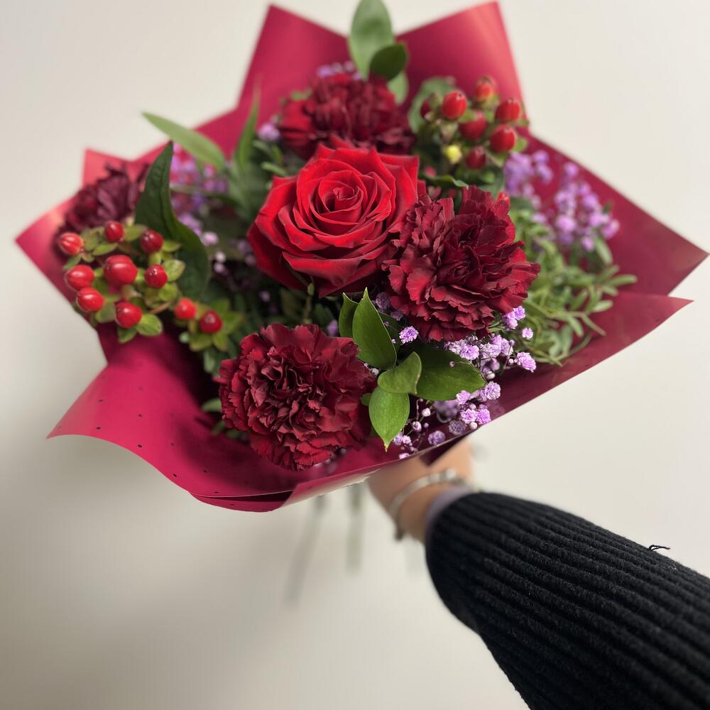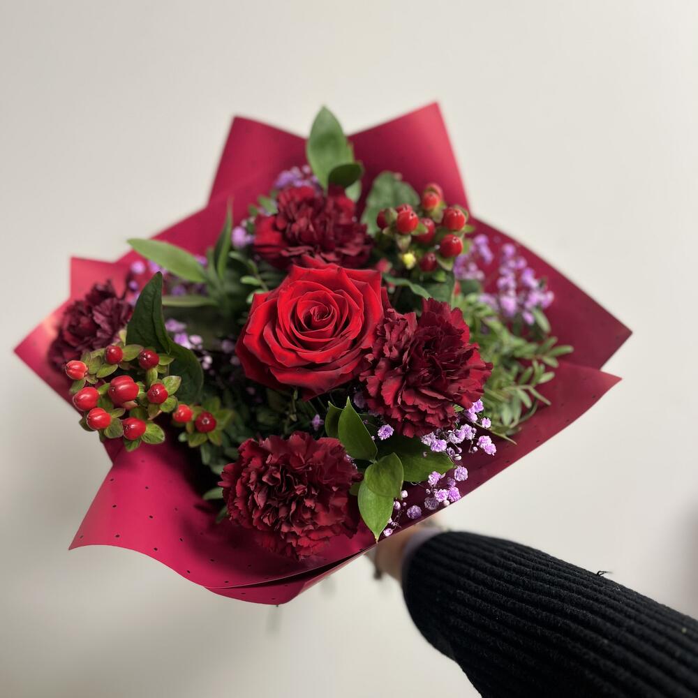 Ruscus - 3 ud. hypericum - 2 ud. gipsophila - 1 ud. goździk - 4 ud. rosa explorador - 1 ud.