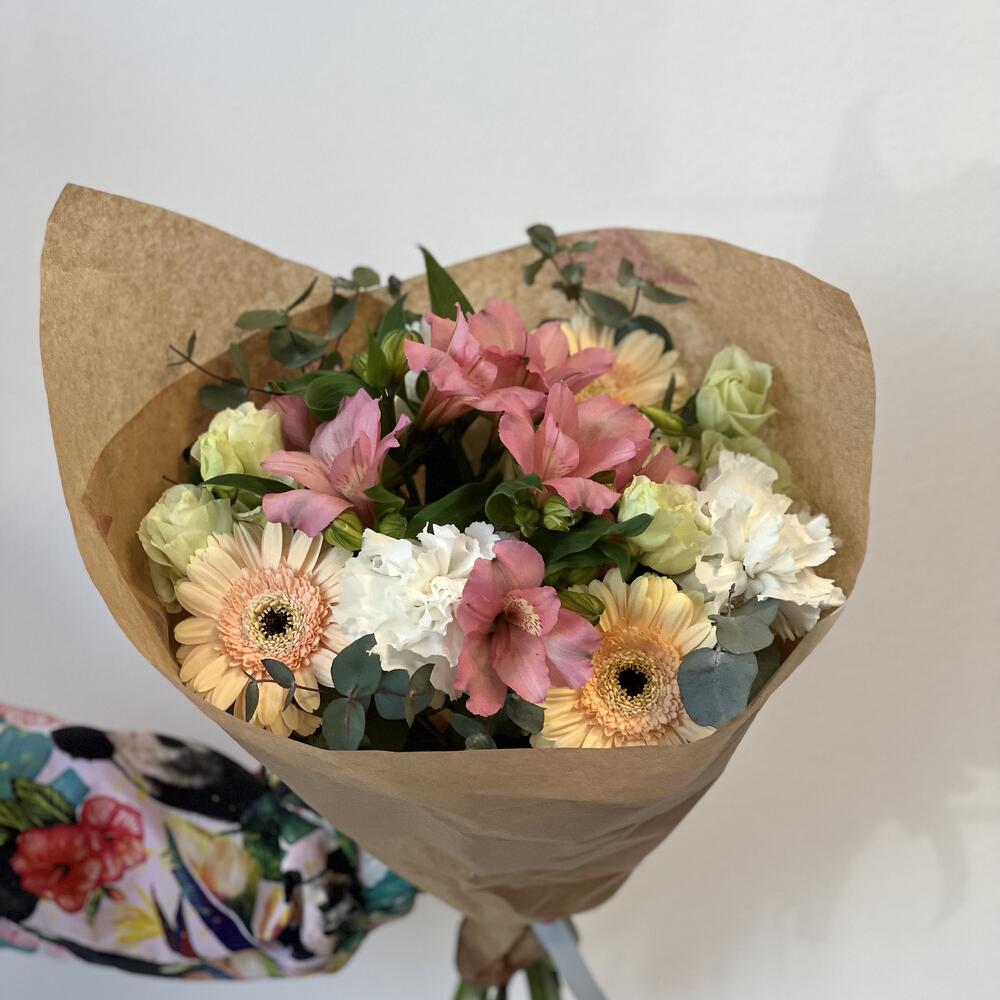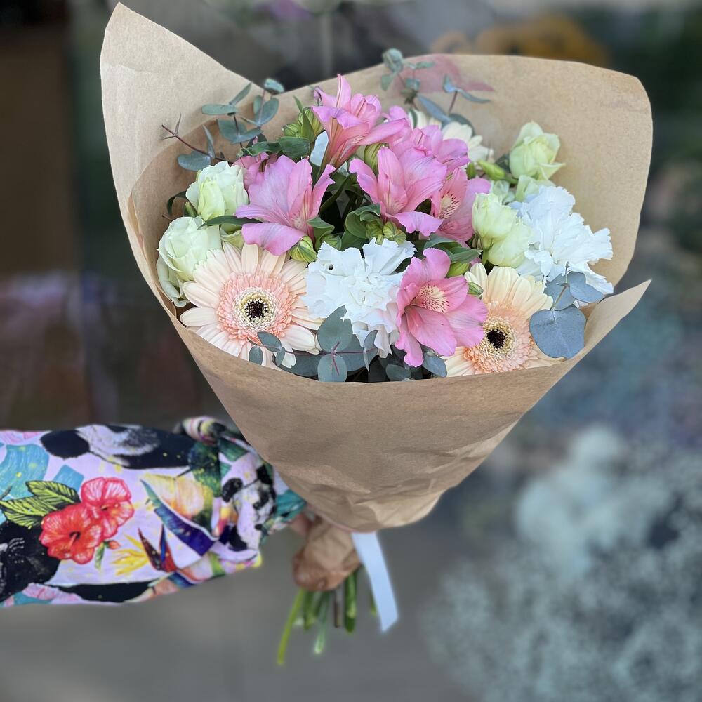 Eustoma - 1 ud. goździk - 3 ud. alstroemeria - 1 ud. eucalipto - 1 ud. gerbera - 3 ud.
