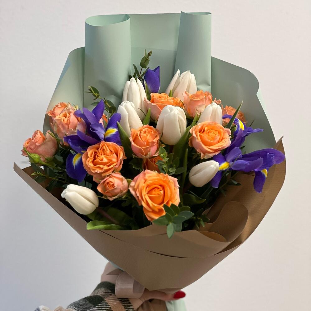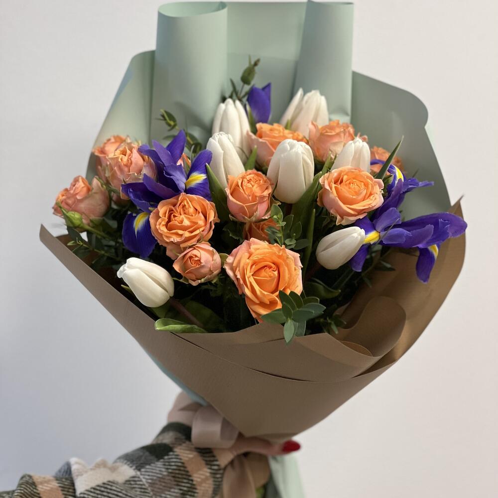 tulipan - 7 ud. iris - 3 ud. rosa en rama - 3 ud. follaje cortado - 5 ud.