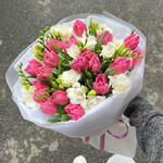 Lekki i delikatny bukiet z tulipanami w połączeniu z pachnącymi frezjami.
