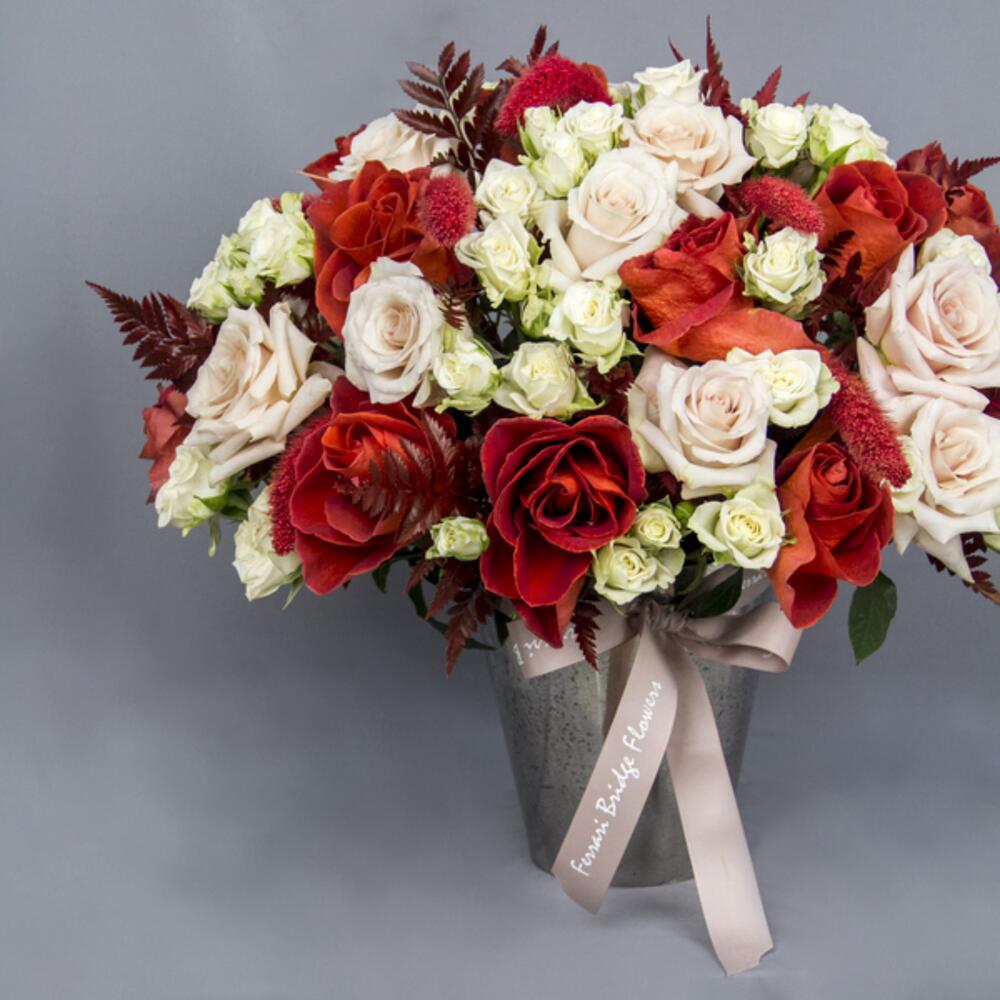 An arrangement in a metallic vase with different colors of Roses, Baby Roses and Carnation.
