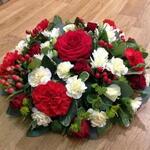Greens - 5 ud. clavel rojo - 6 ud. red roses - 6 ud. clavel blanco de relleno - 10 ud.