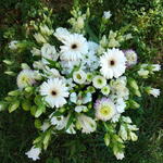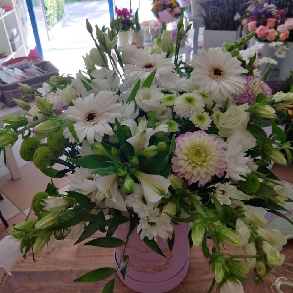 Eustoma - 2 ud. Box - 1 ud. Alstroemeria - 3 ud. Gerbera - 5 ud. santini - 3 ud. bush chrysanthemum - 2 ud. melena de león - 6 ud.