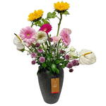Black ceramic vase arranged with sunflower, jerbera and anthurium together with greens