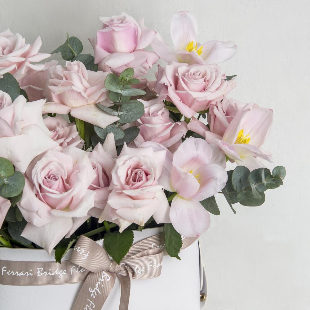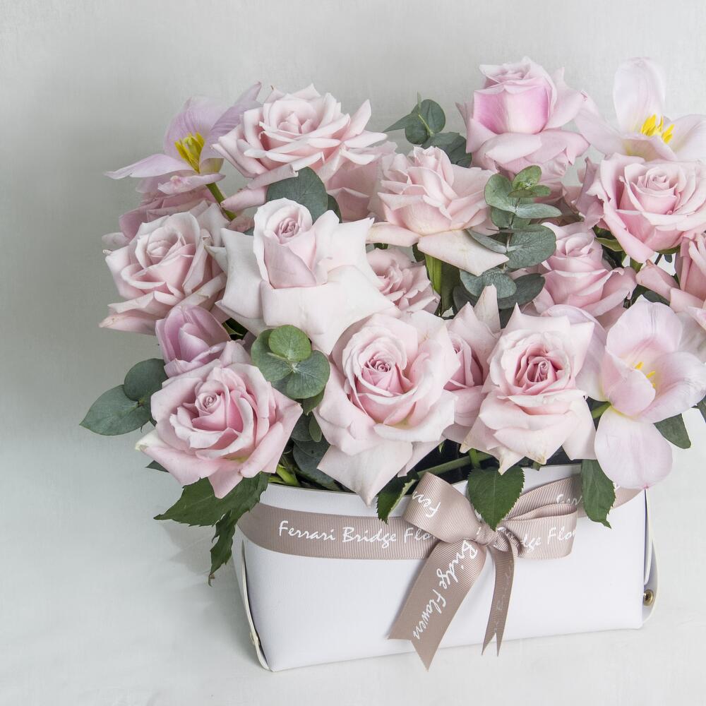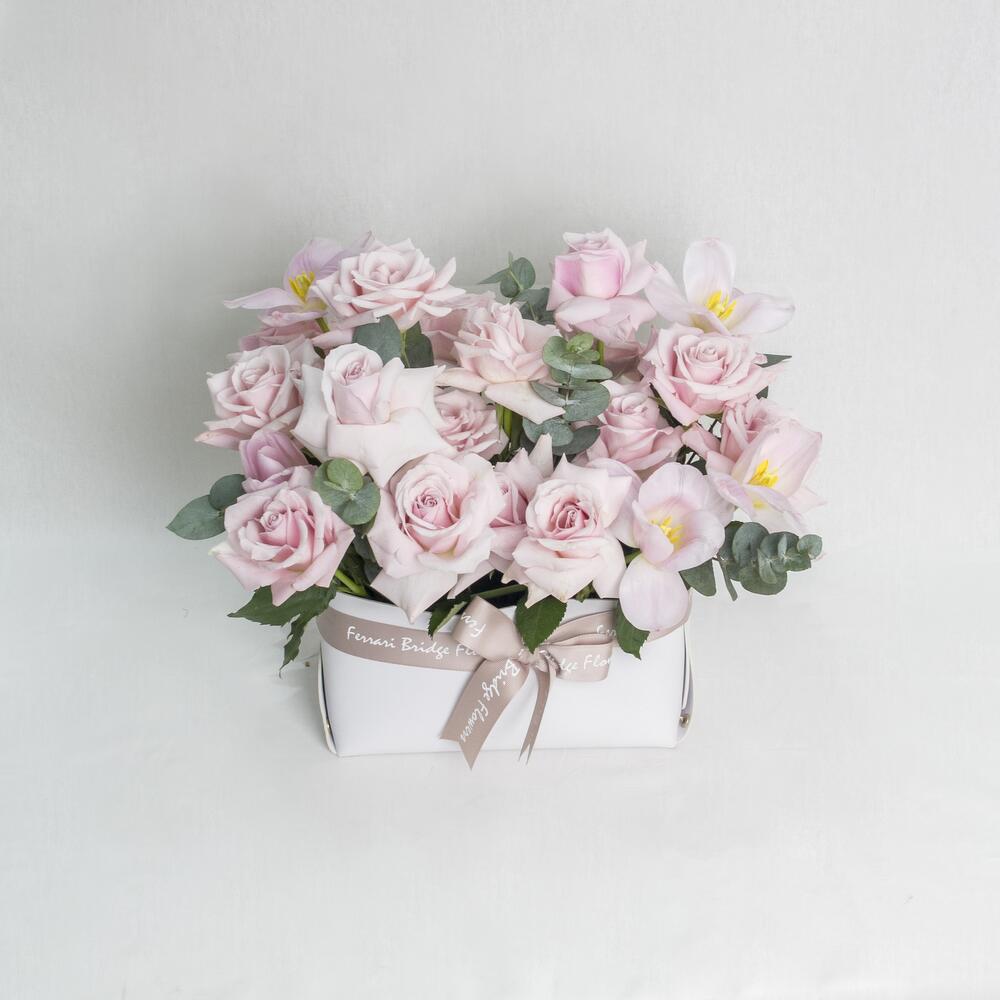 Eucalyptus - 2 ud. Tulips - 4 ud. leather bag - 1 ud. roses - 12 ud.