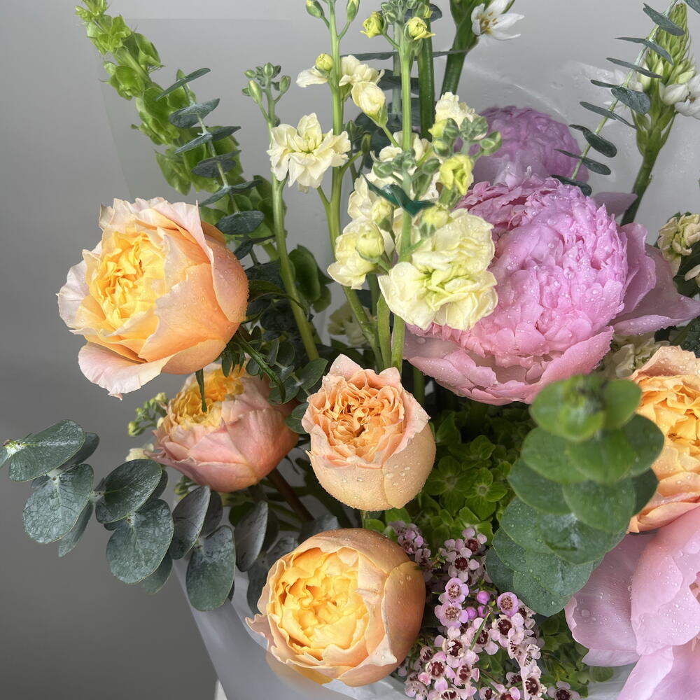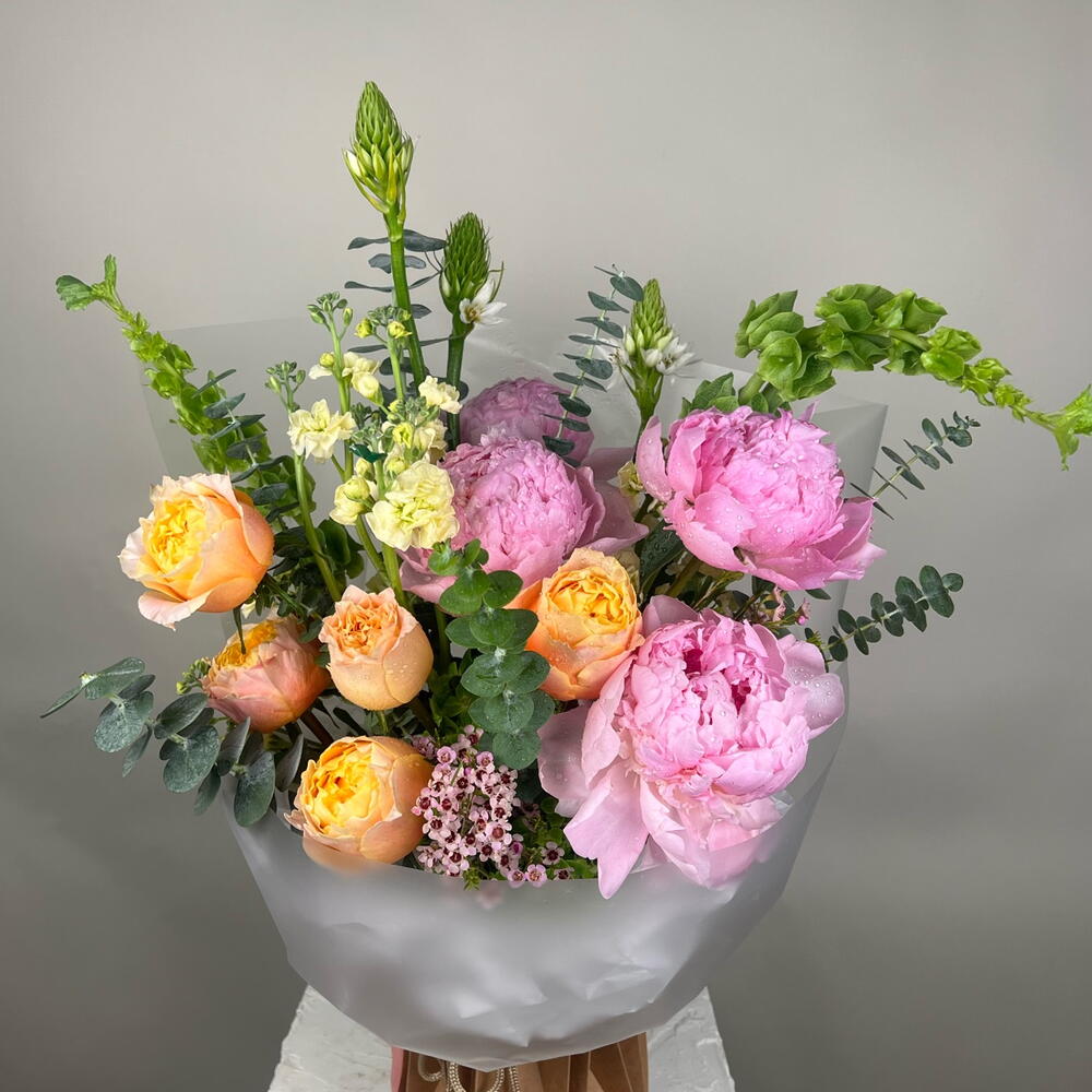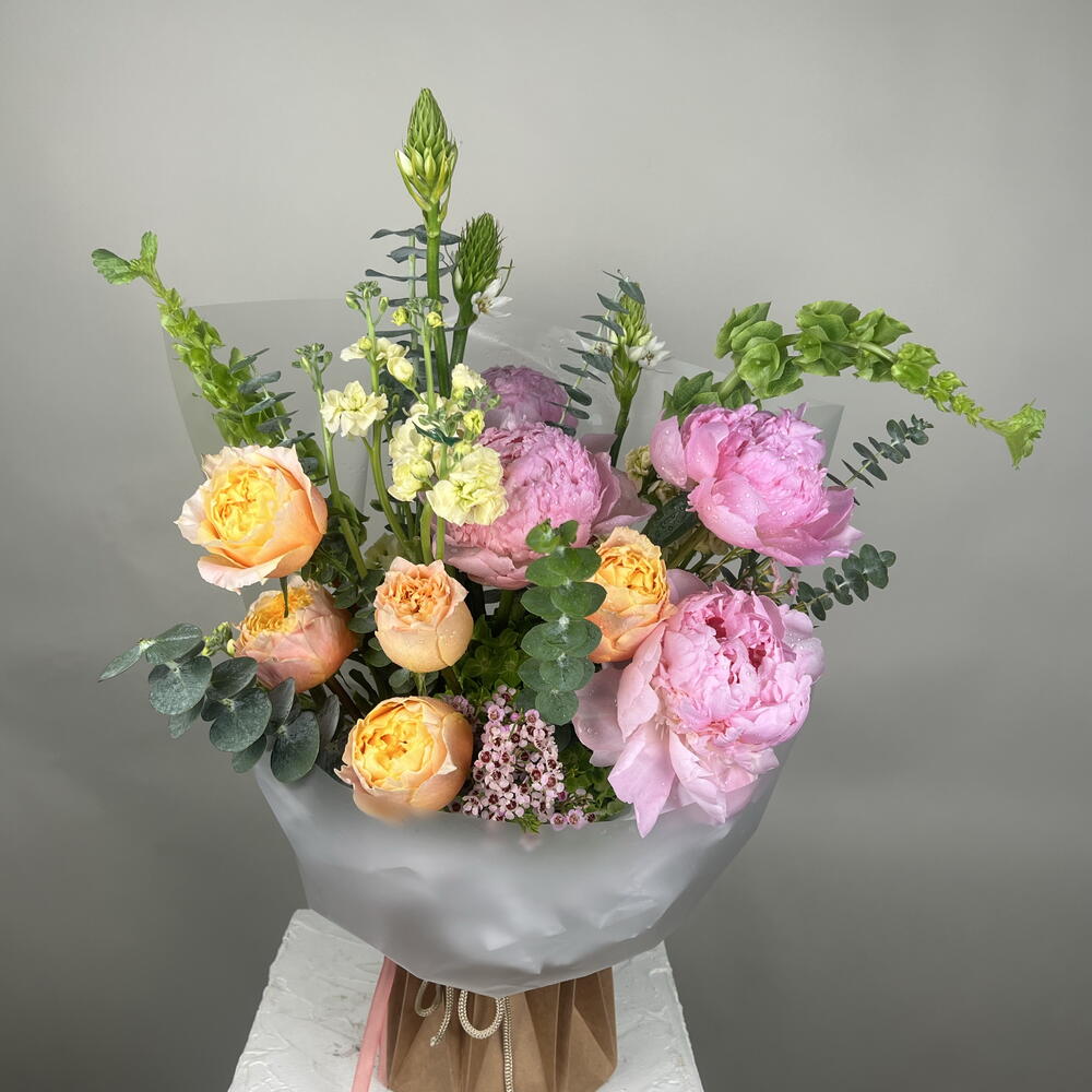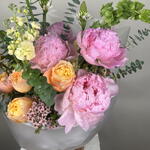 peonies pink - 4 ud. hortensia - 5 ud. rosas de jardín - 5 ud. flores en stock - 4 ud. mezcla de follaje - 1 ud. campanas irlandesas - 2 ud. estrella de belén - 3 ud.