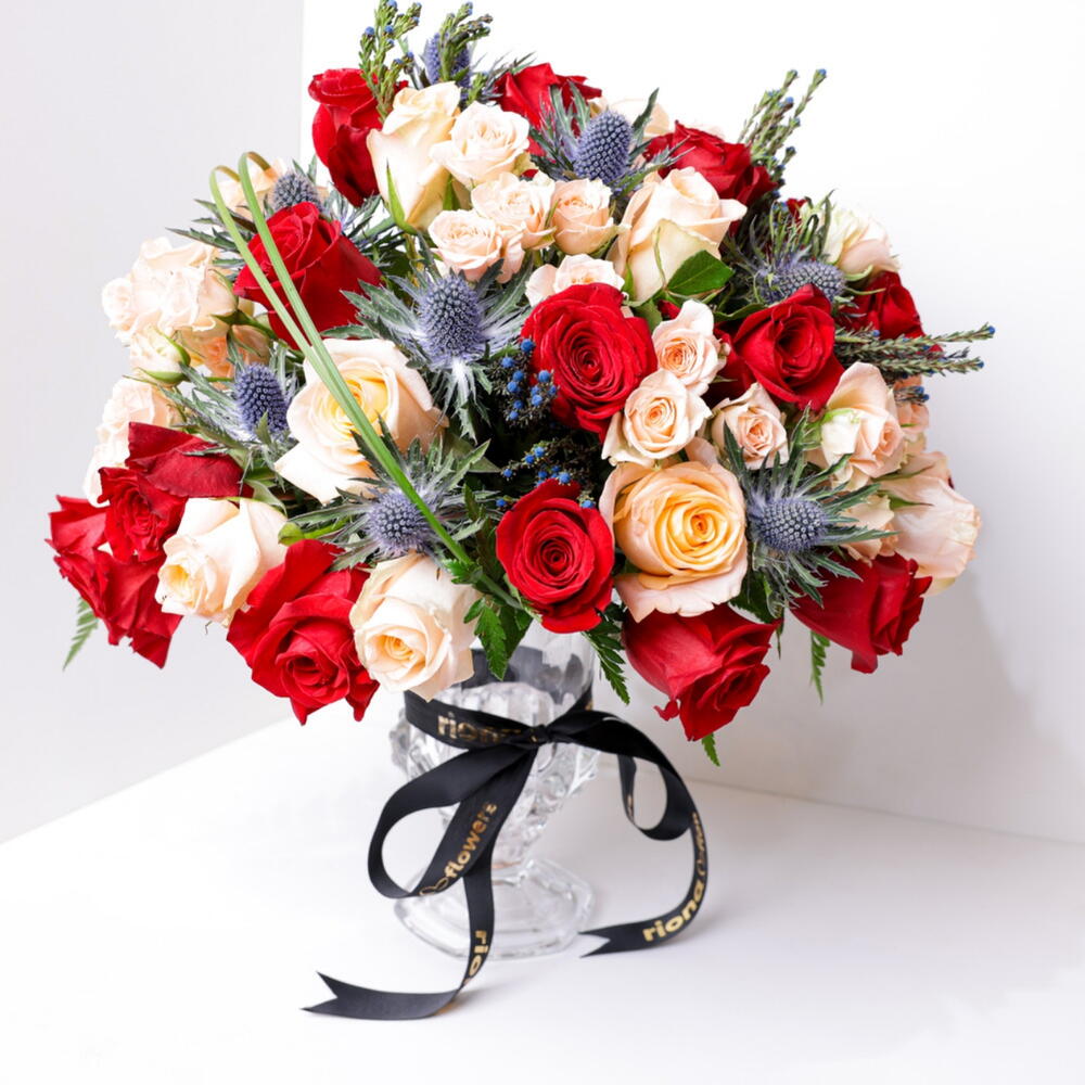 Glass Vase arranged with peach and red roses together with elingium