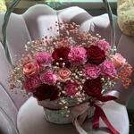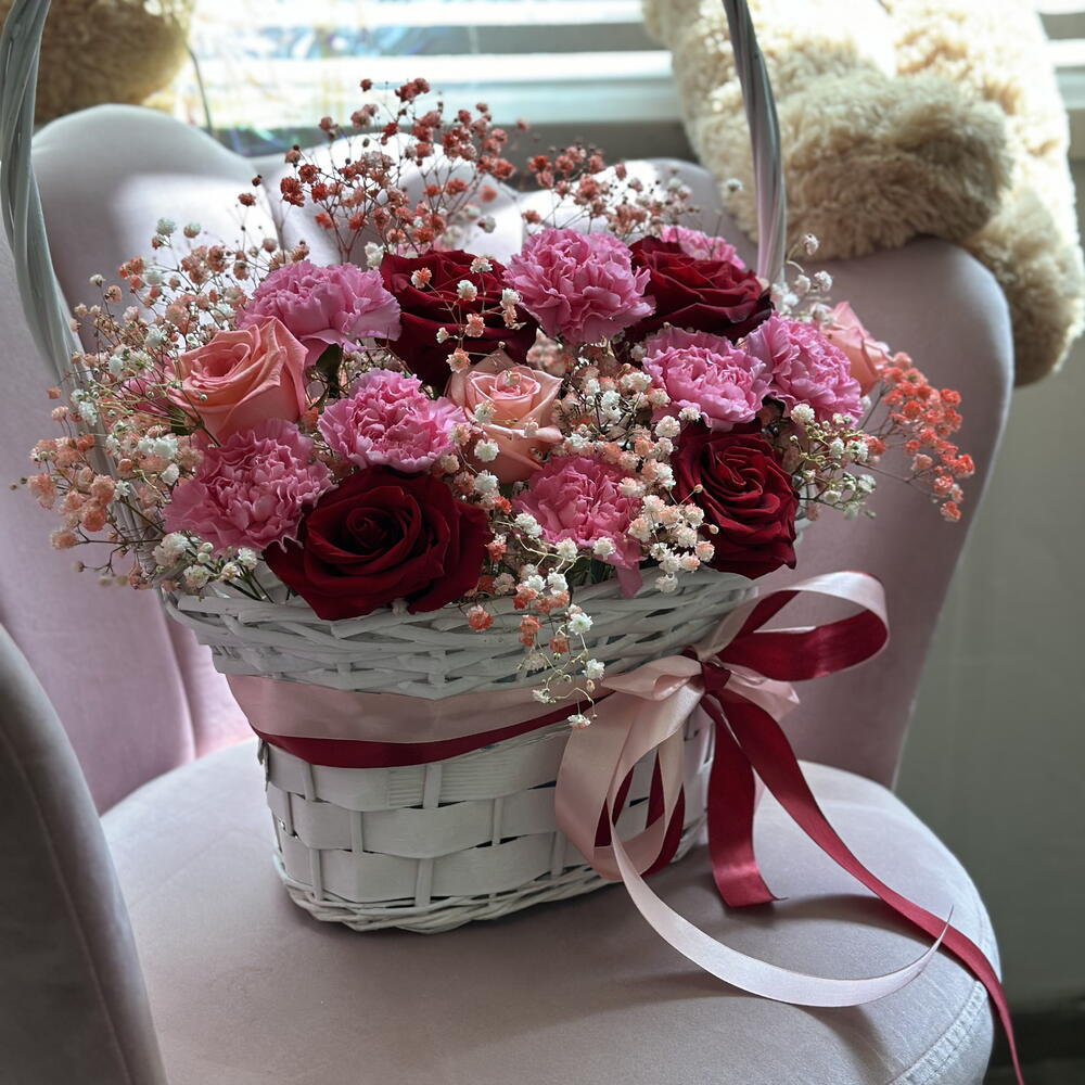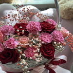 gipsofila - 5 ud. diantus - 10 ud. rosa roja - 4 ud. rosa rosada - 3 ud. cesta - 1 ud.