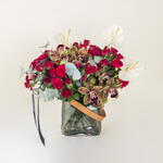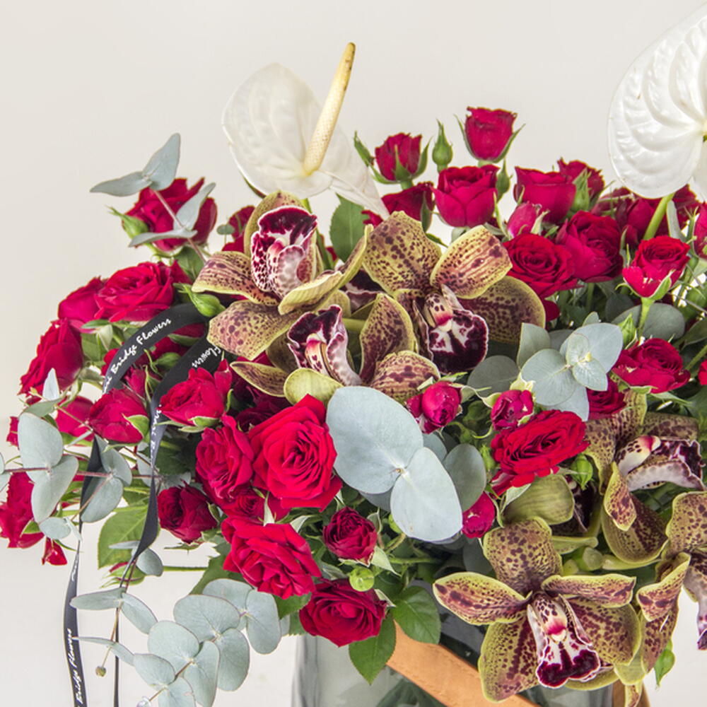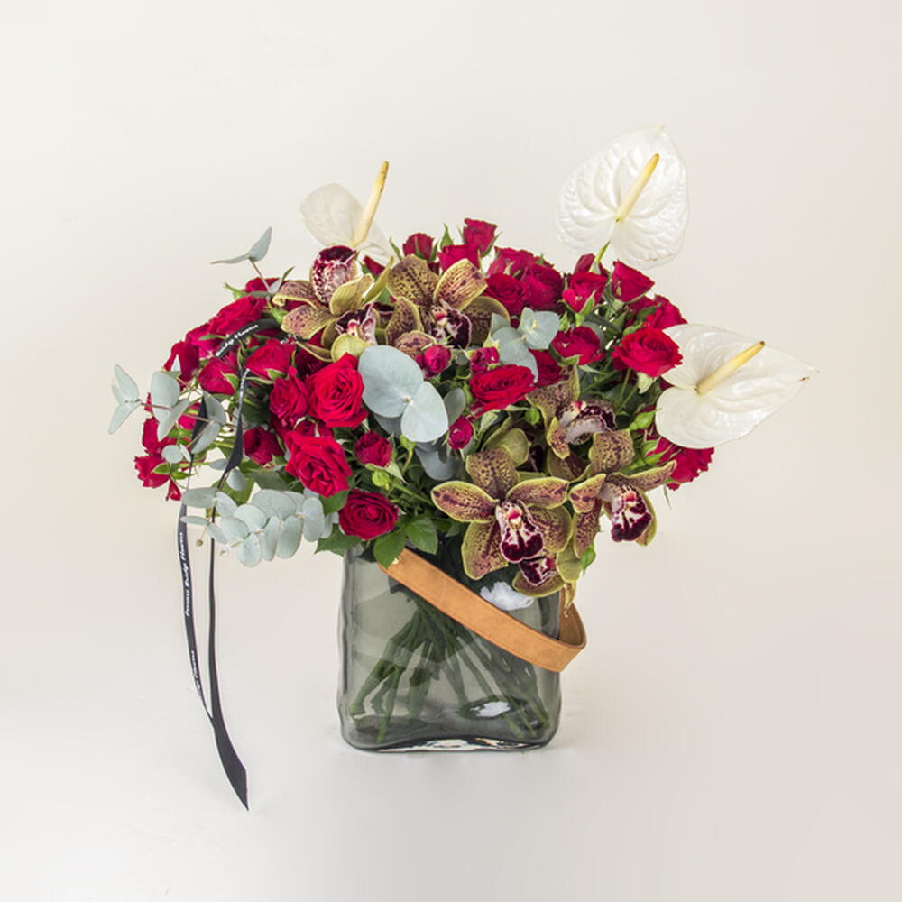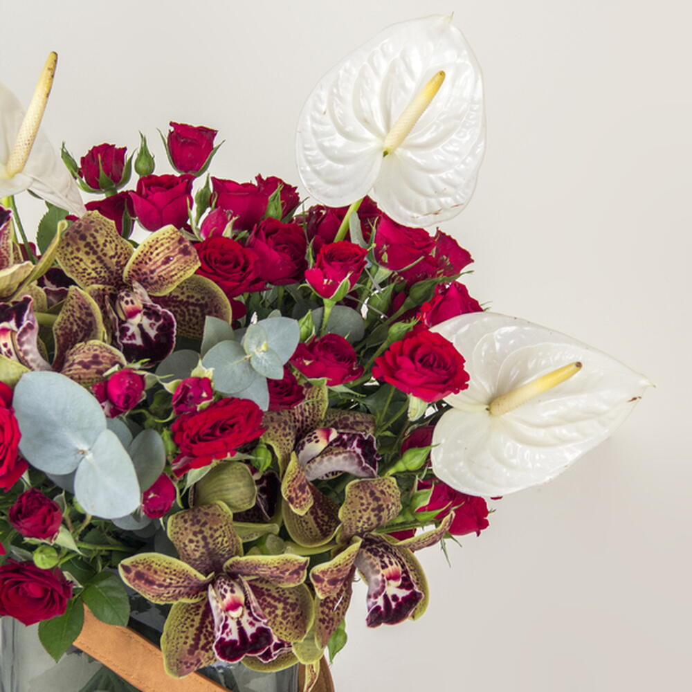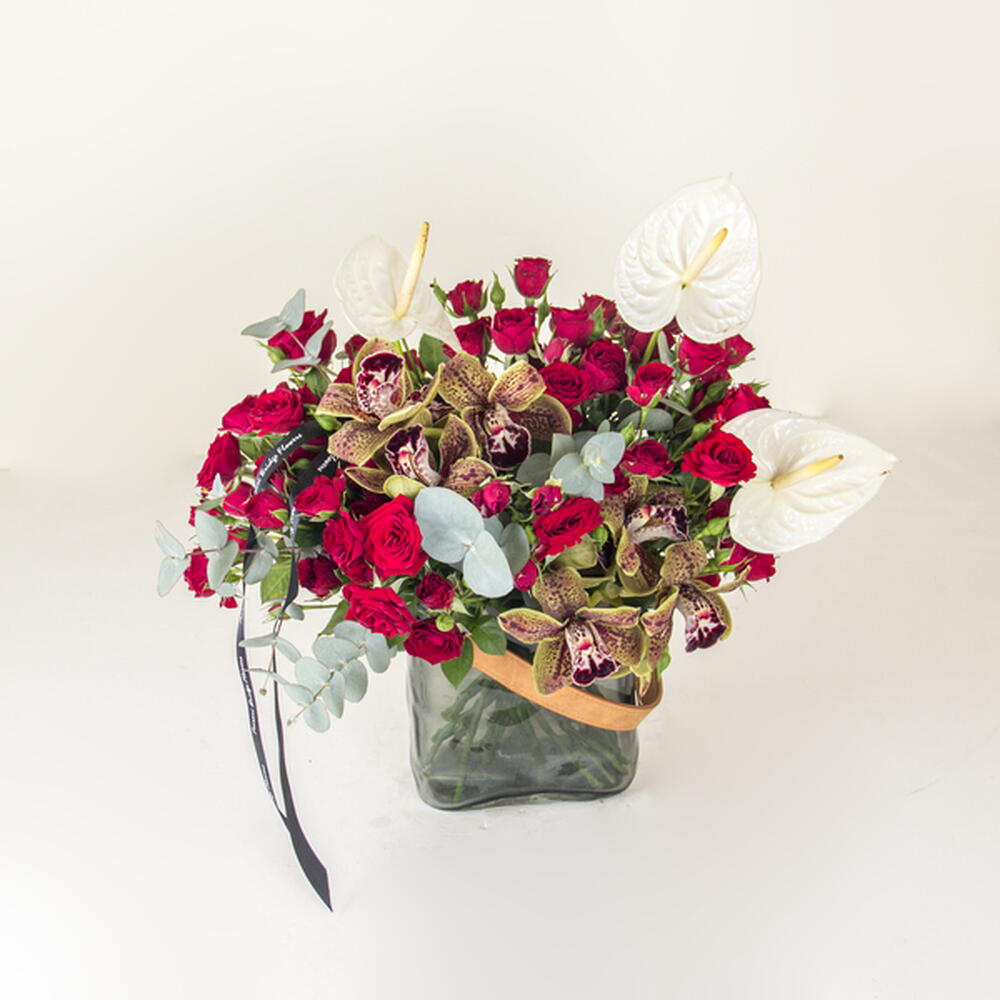 Anthurium - 3 ud. jarrón de cristal - 1 ud. cymbidium orchids - 5 ud. spray roses - 10 ud.