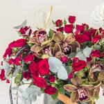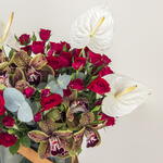 The combination of the classic rose with the more exotic orchids and anthuriums, along with the textural eucalyptus, creates a bouquet that is both elegant and intriguing.
