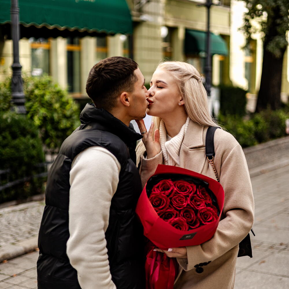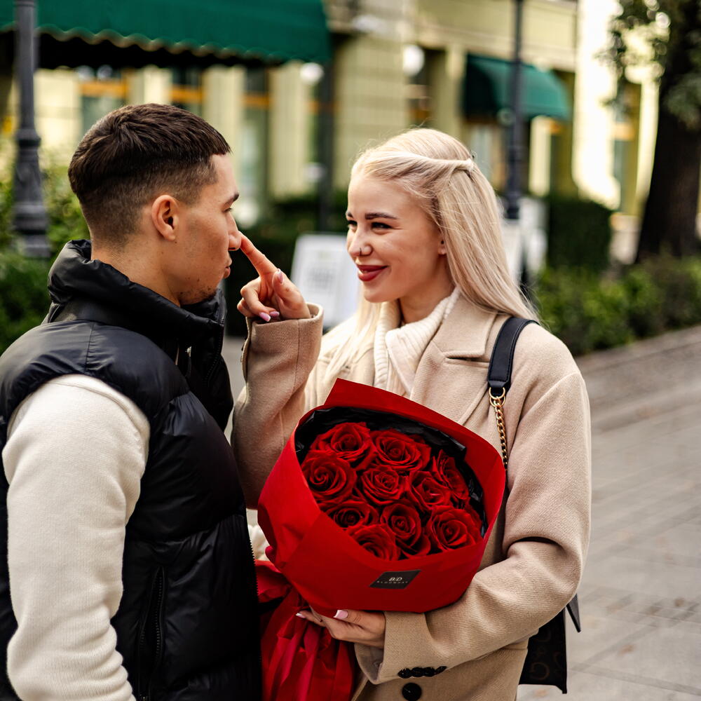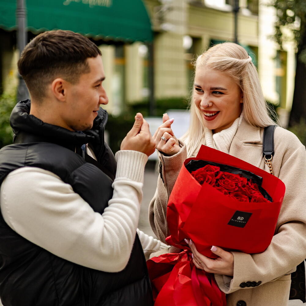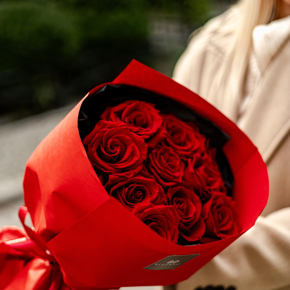 Un elegante ramo de rosas rojas. El ramo incluye rosas de la más alta calidad importadas de Colombia y Ecuador. *Si falta alguno de los componentes del ramo, el florista se reserva el derecho de reemplazar las flores faltantes por las más similares en apariencia, color y precio. Las flores son seres vivos y su estacionalidad las caracteriza. Nuestros floristas conservarán los colores, el tamaño y la atmósfera del ramo.