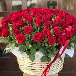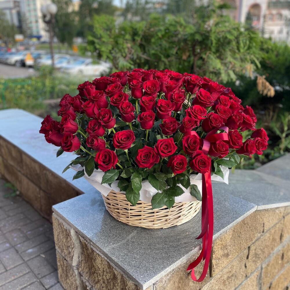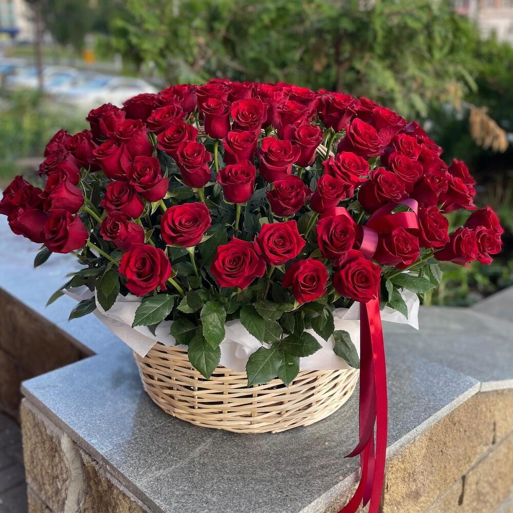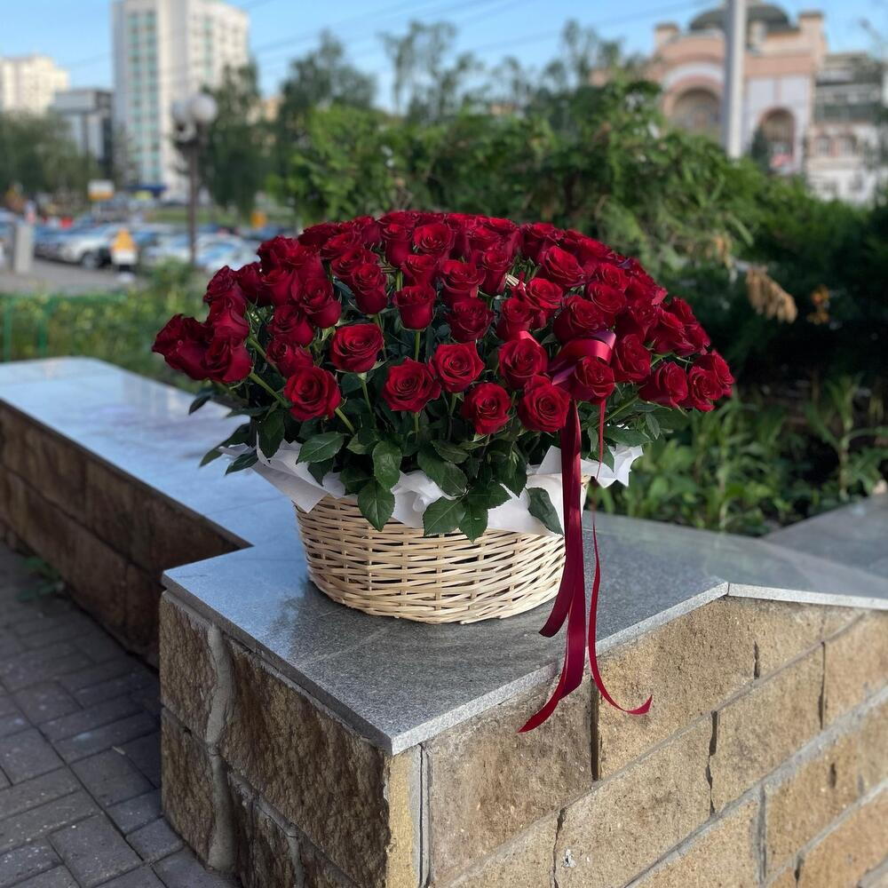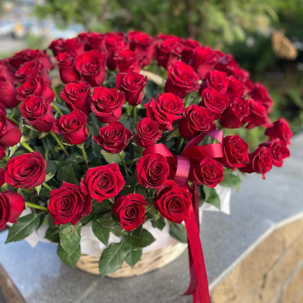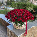 Cesta de mimbre - 1 ud. La cinta de satén - 1 ud. биофлор - 3 ud. rosas rojas - 101 ud.