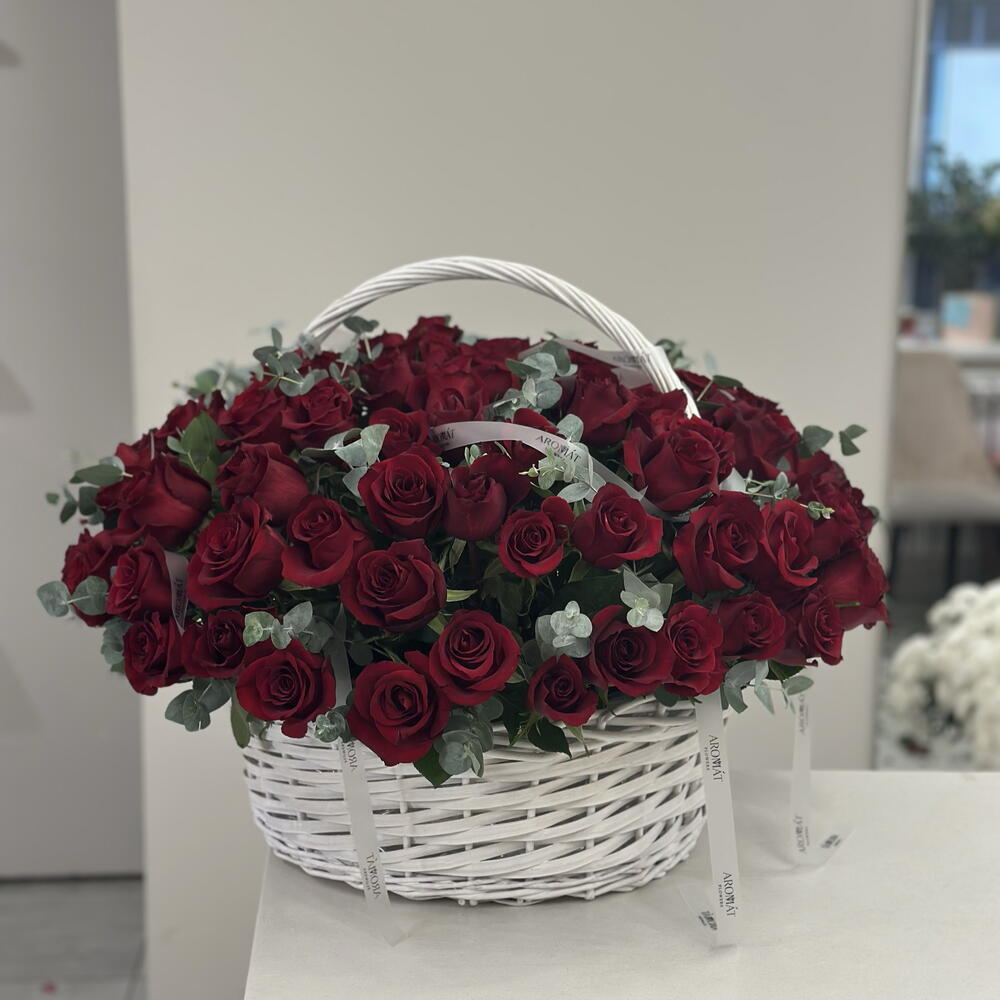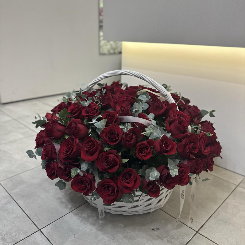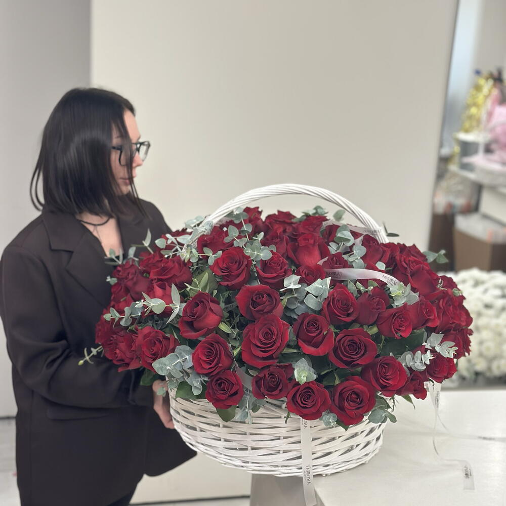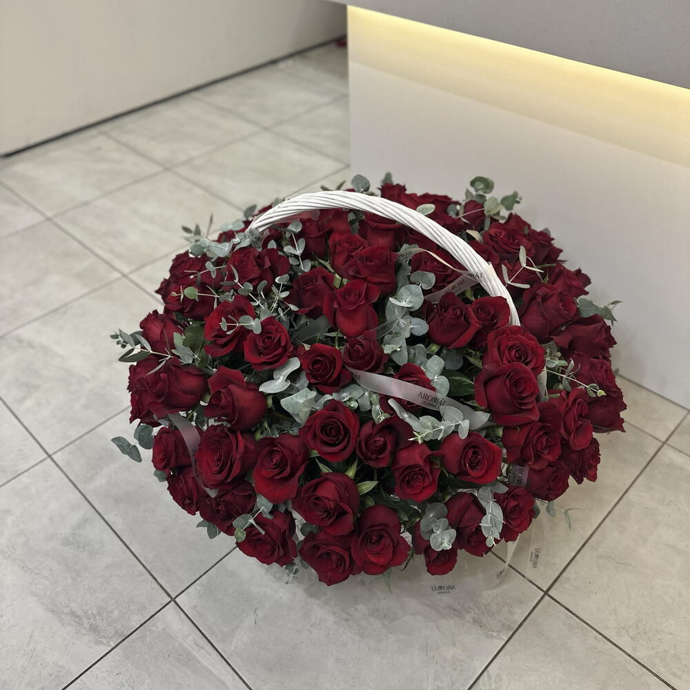 Подарите самое мощное признание в любви и безграничном восхищении с этой поистине королевской корзиной! 101 великолепная красная роза, дополненная стильной свежестью эвкалипта, создает композицию невероятной красоты и объема. Это не просто подарок, это целая история, рассказанная языком пламенных чувств, которая навсегда останется в памяти!