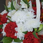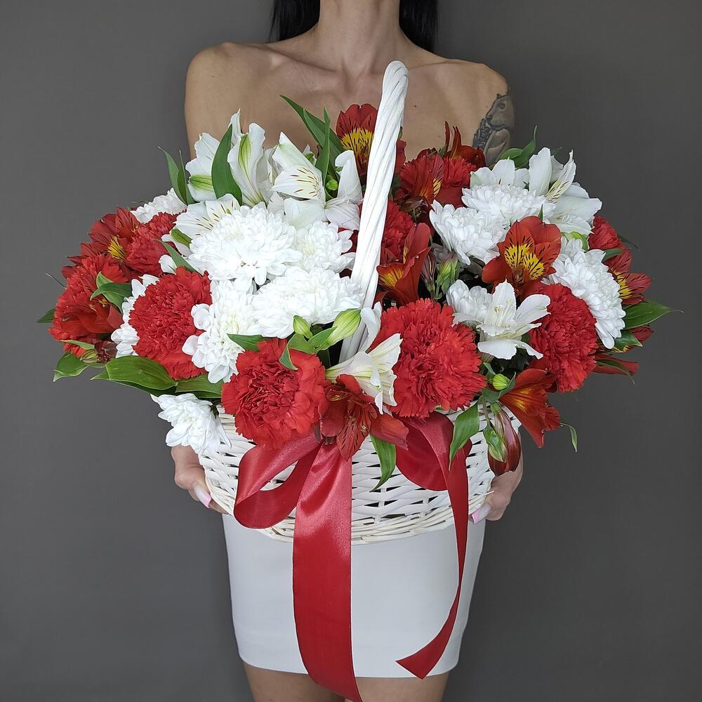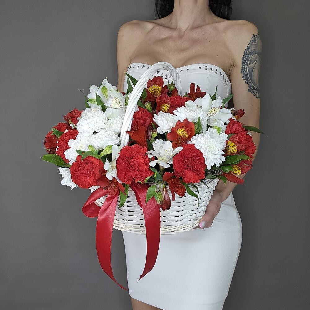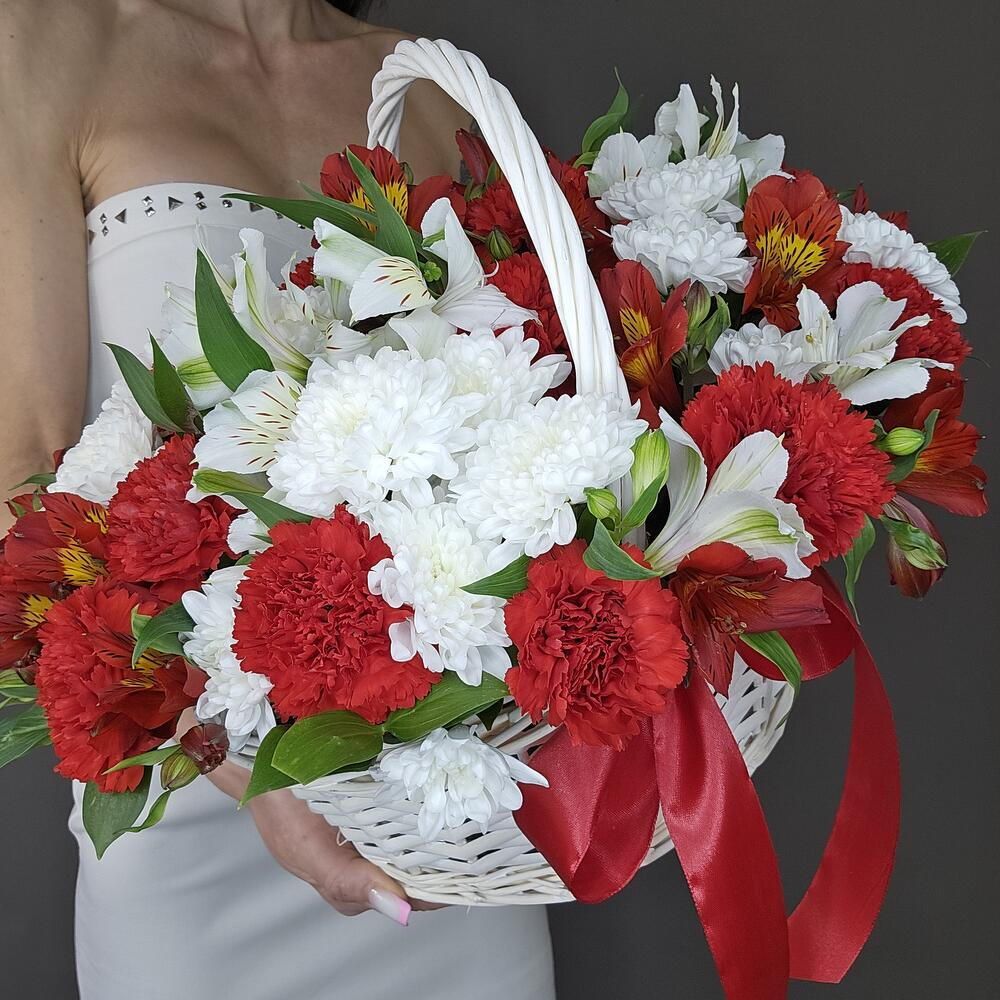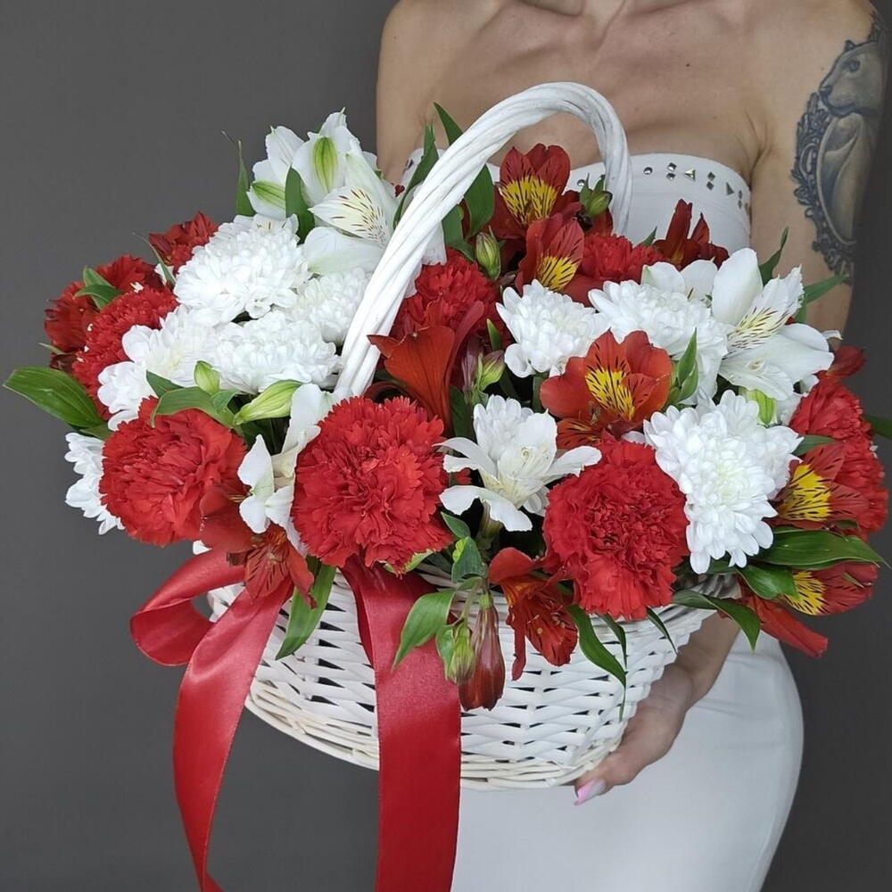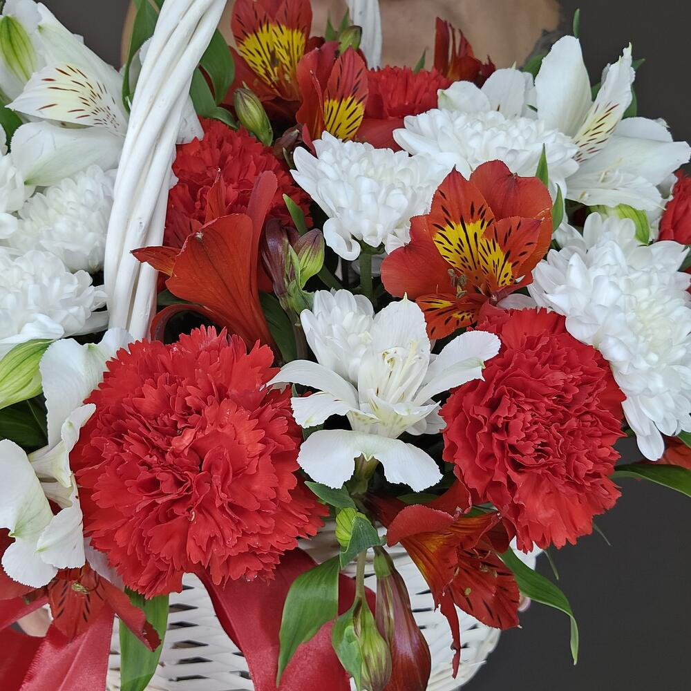 Альстромерия - 9 ud. Crisantemo кустовая - 9 ud. El clavel - 9 ud. Cinta de raso - 2 ud. Cesta de mimbre - 1 ud. биофлор - 2 ud.