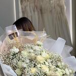 Eustoma white - 6 ud. santini - 7 ud. gipsofilia - 17 ud. envoltorio de papel florístico - 1 ud. rosa blanca - 12 ud.