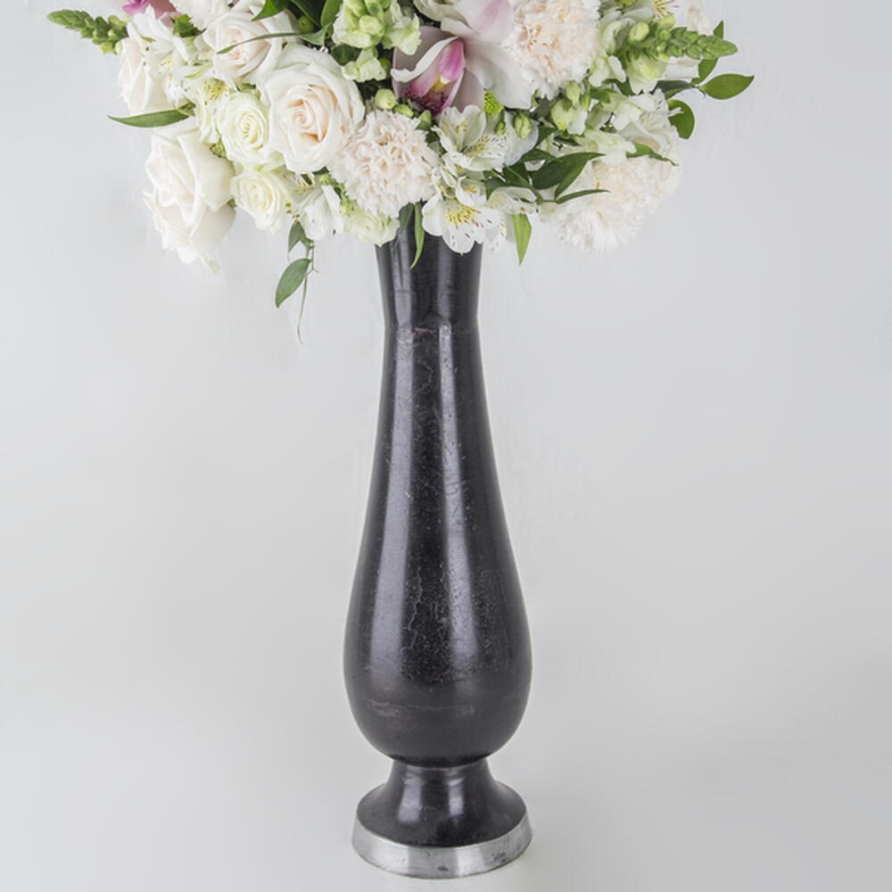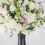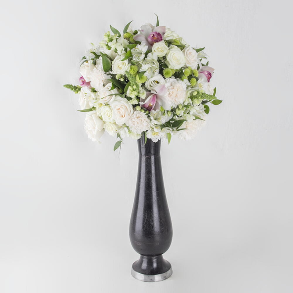 A long vase arrangement of white roses, green chrysanthemum buds and white and green mix flowers and leaves