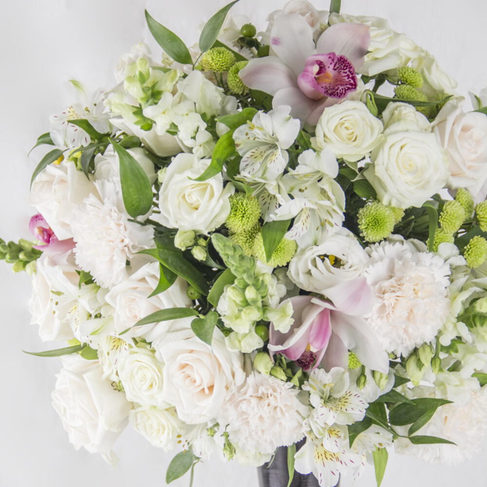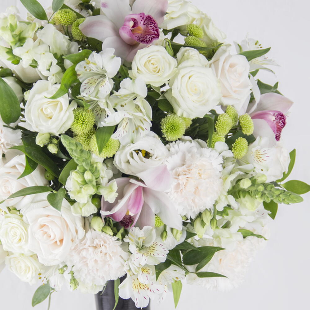 Greens - 10 ud. cymbidium orchids - 7 ud. roses - 30 ud.