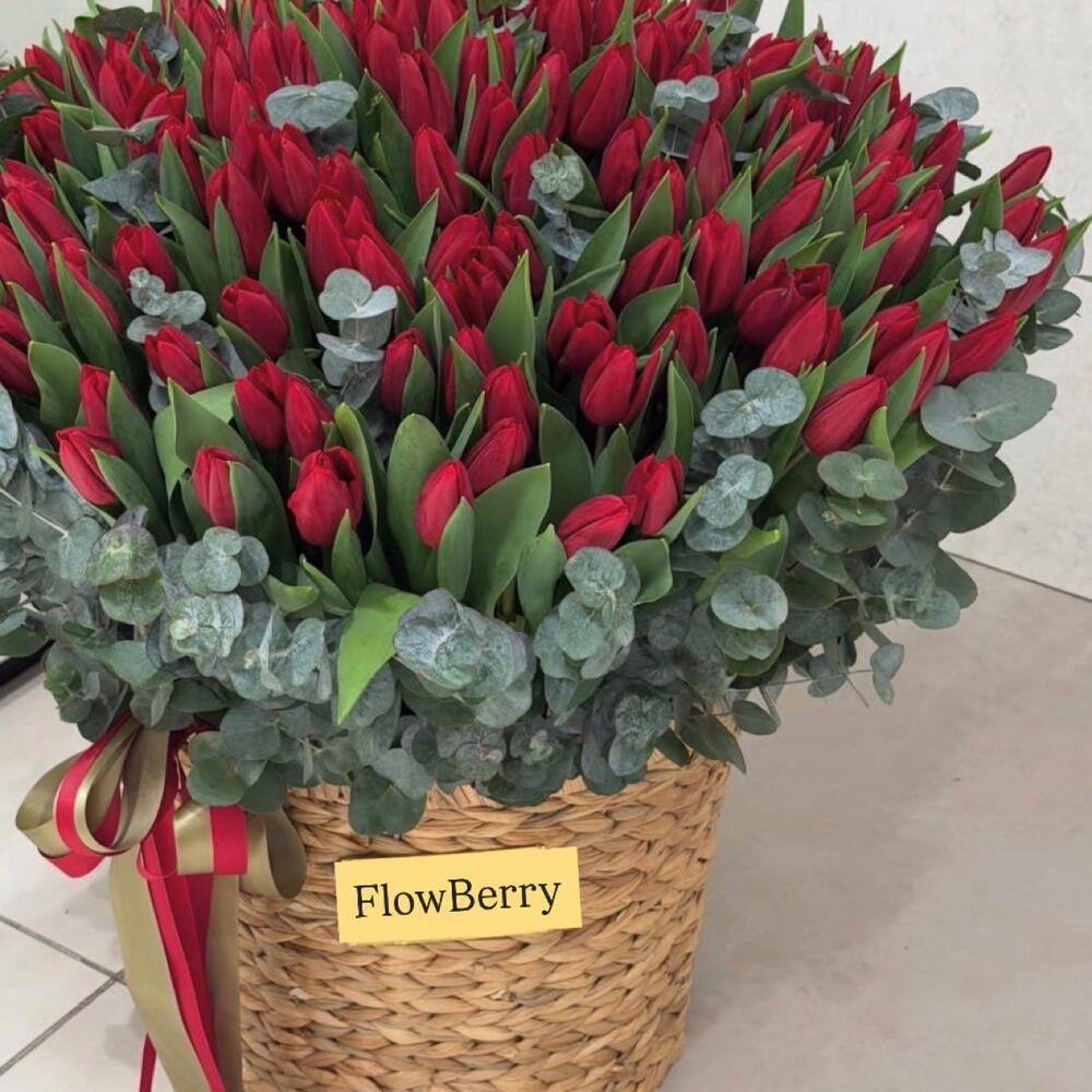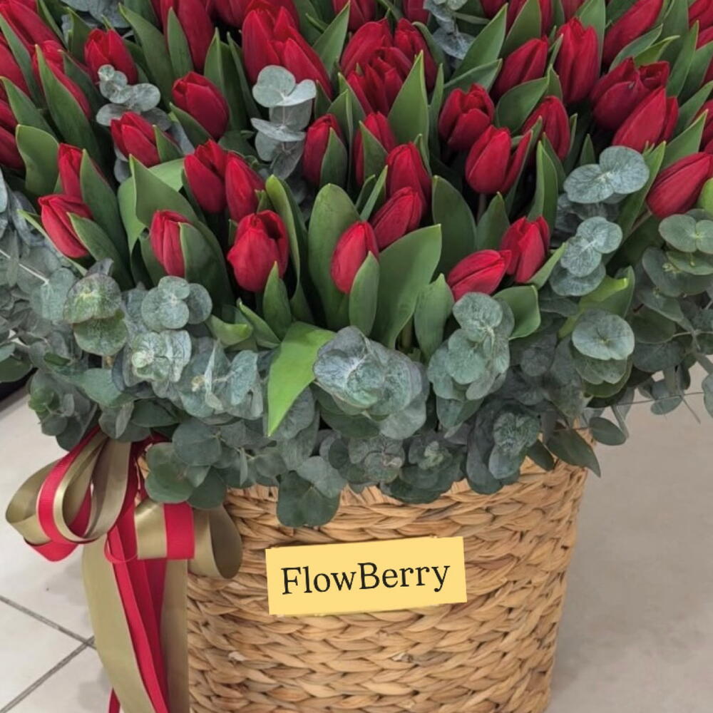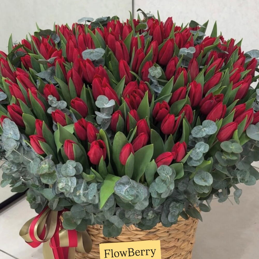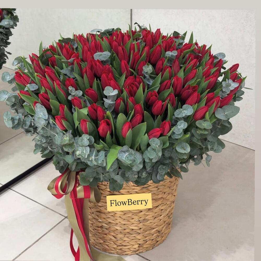Роскошная композиция из свежих красных тюльпанов, оформленных в стильную плетёную корзину и дополненных благородным эвкалиптом. Бутоны тюльпанов плотные, ещё не полностью раскрытые — они будут красиво распускаться в течение нескольких дней, радуя получателя свежестью и объёмом. Этот букет идеально подойдёт для признания в любви, юбилея, дня рождения или эффектного сюрприза без повода. Минимализм, объём и премиальное оформление — всё, чтобы произвести впечатление. тюльпаны красные тюльпаны корзина с тюльпанами большой букет премиум букет букет в корзине цветы в корзине тюльпаны с эвкалиптом роскошный букет подарок женщине букет на 8 марта букет на день рождения цветы в Ереване