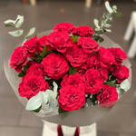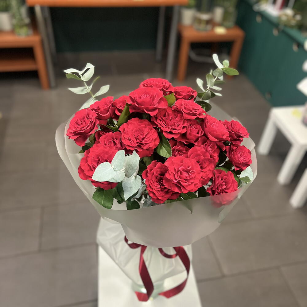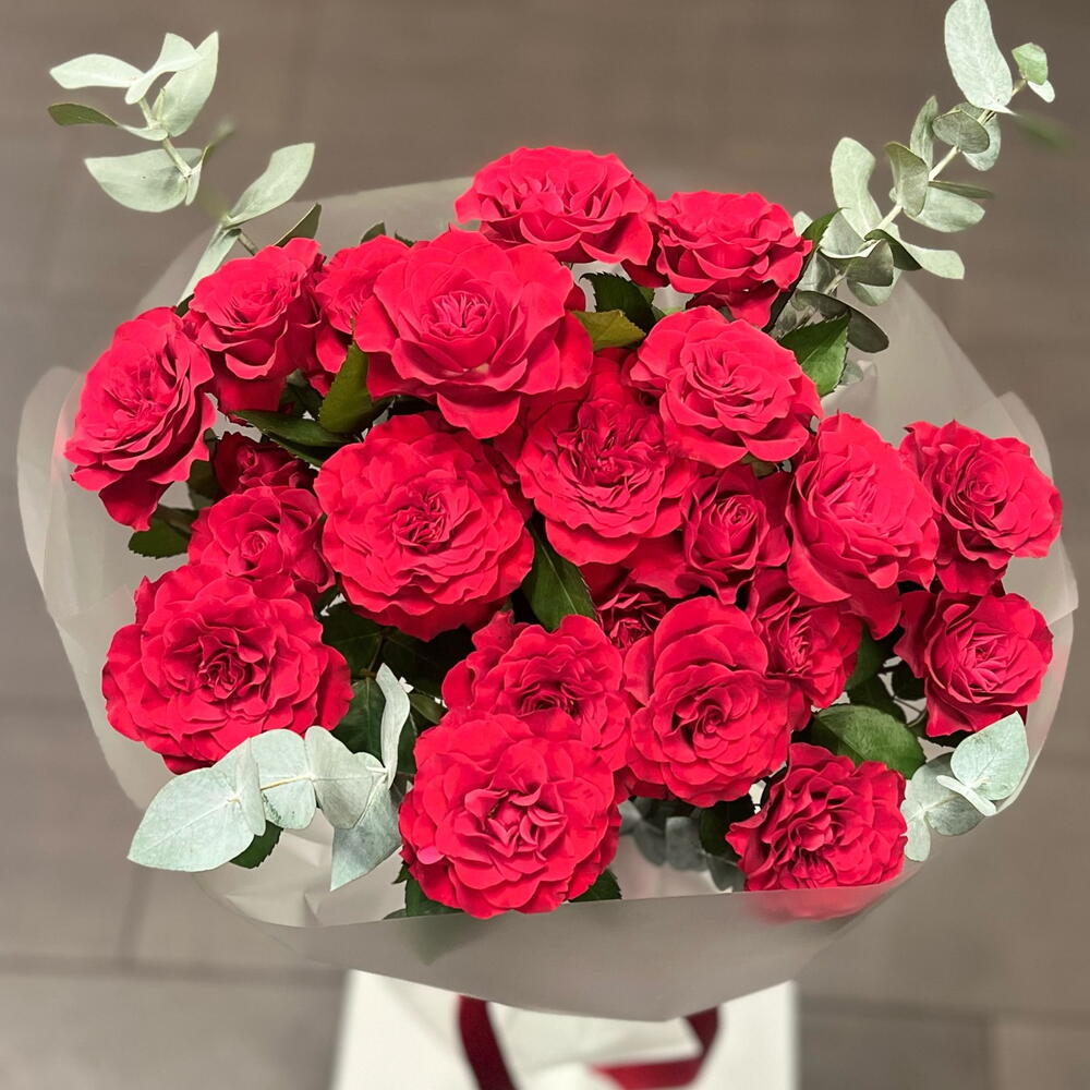 eucalipto - 3 ud. papier dekoracyjny - 2 ud. wstążka - 1 ud. rosa en rama roja premium - 5 ud.