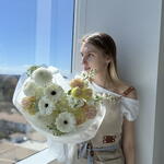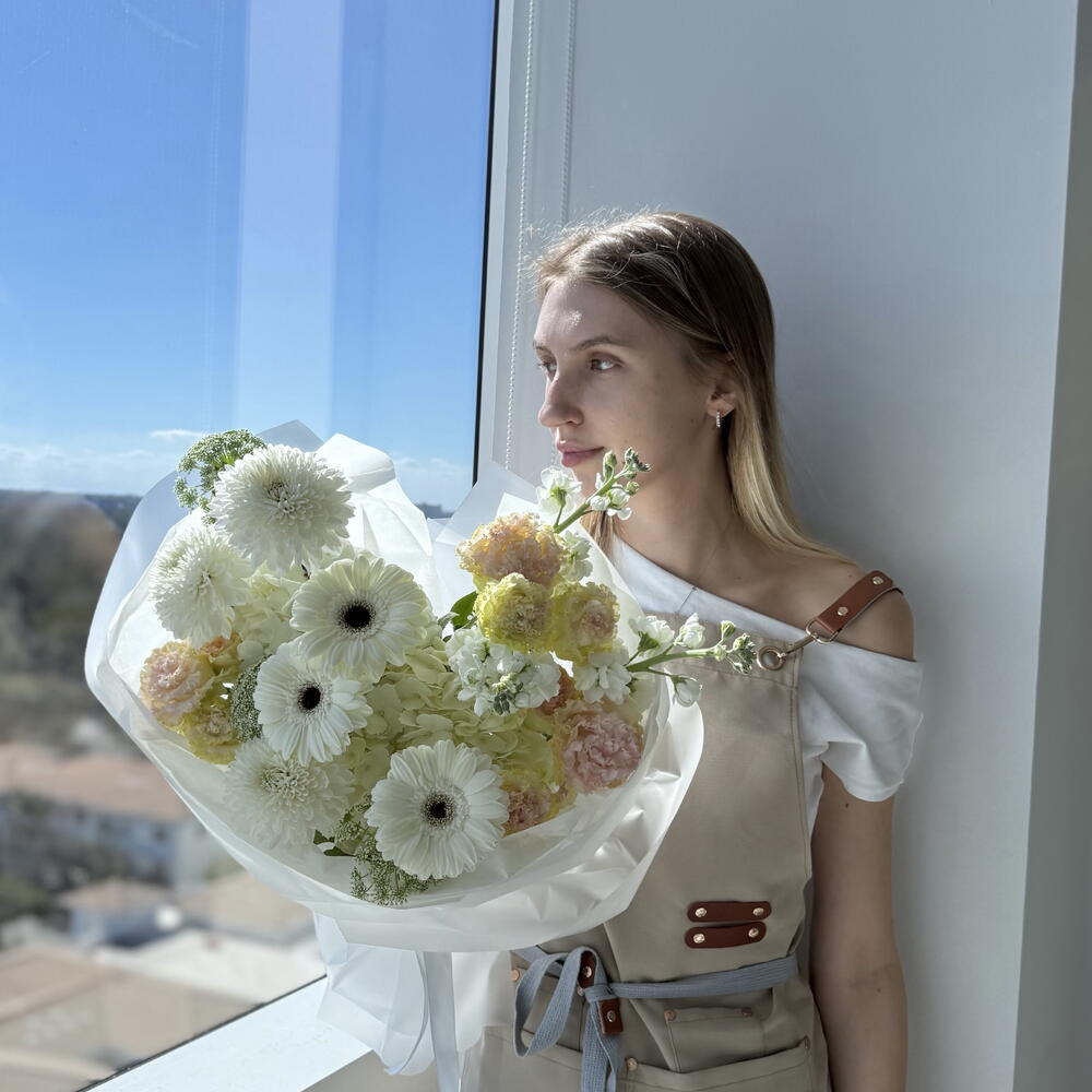 Eustoma - 3 ud. Hydrangea - 3 ud. Viburnum - 3 ud. Gerbera - 3 ud. Lisianthus - 4 ud. matthiola - 3 ud.