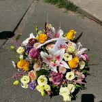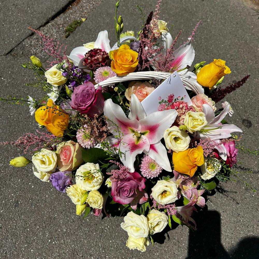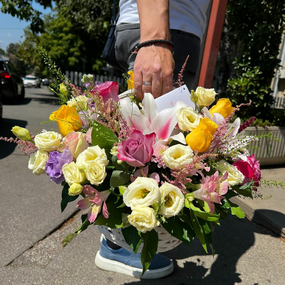 Greenery - 8 ud. El crisantemo - 5 ud. Solidago - 4 ud. Basket - 1 ud. Lisianthus - 5 ud. roses - 9 ud. lilly oriental - 1 ud.