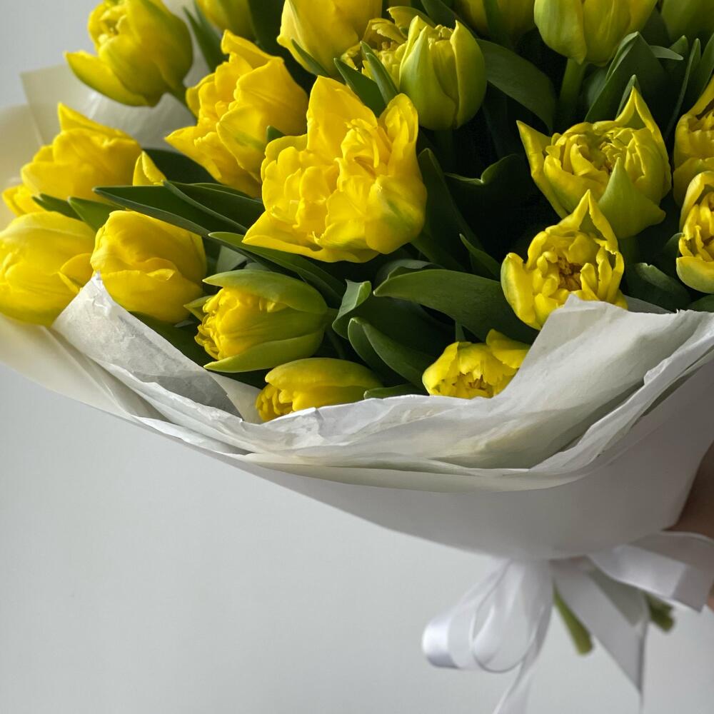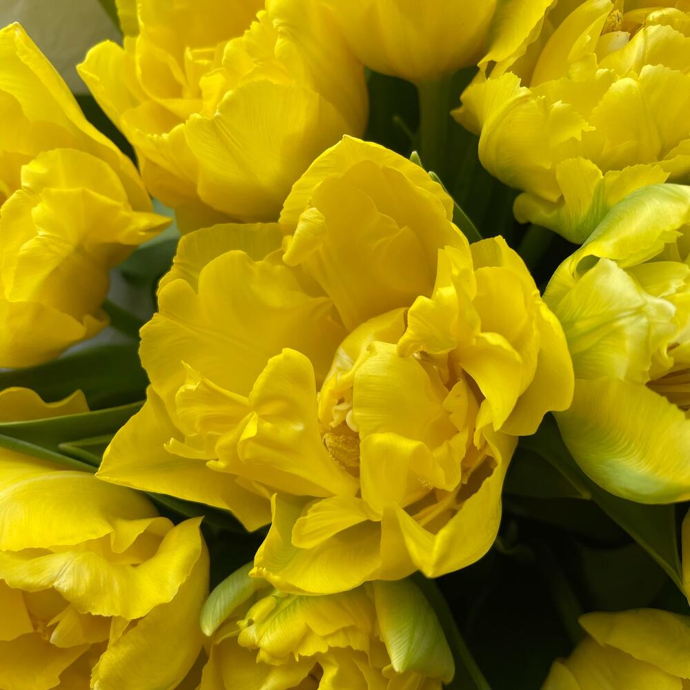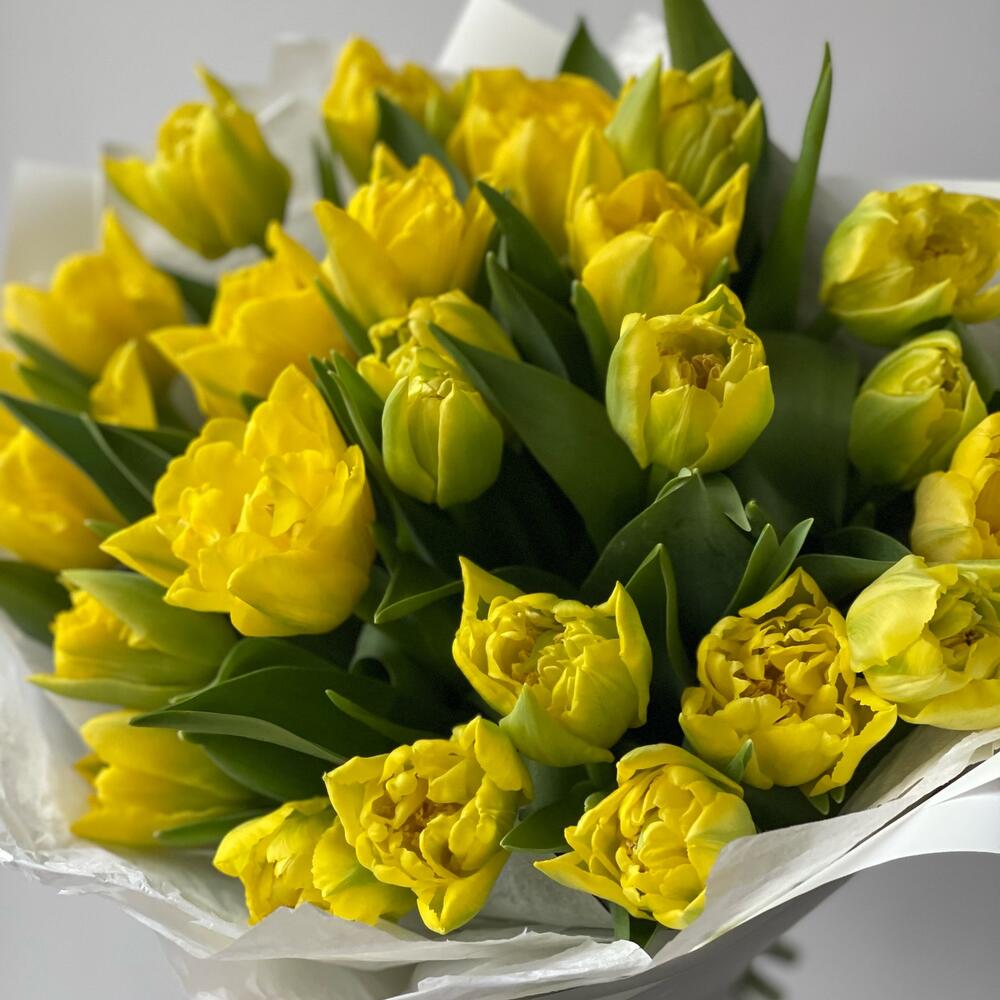 Bukiet z żółtych tulipanów pełnokwiatowych — subtelna elegancja i radość w każdym kwiecie. Te pełne, bujne pąki wyglądają wyjątkowo efektownie i wnoszą odrobinę luksusu na każdą okazję. Na życzenie można wybrać dowolny kolor – wystarczy zaznaczyć preferowany kolor przy składaniu zamówienia.